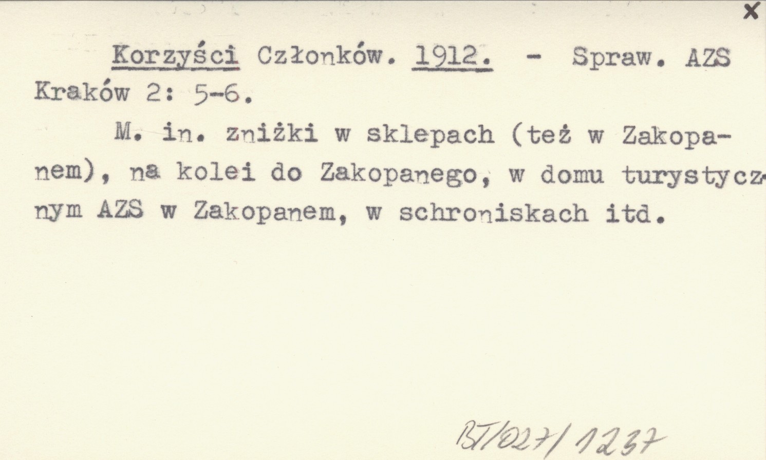 Sprawozdania AZS (Kraków) , 2: 5-6. M.in. zniżki w sklepach (też w Zakopanem), na kolei do Zakopanego, w domu turystycznym AZS w Zakopanem, w schroniskach itd.