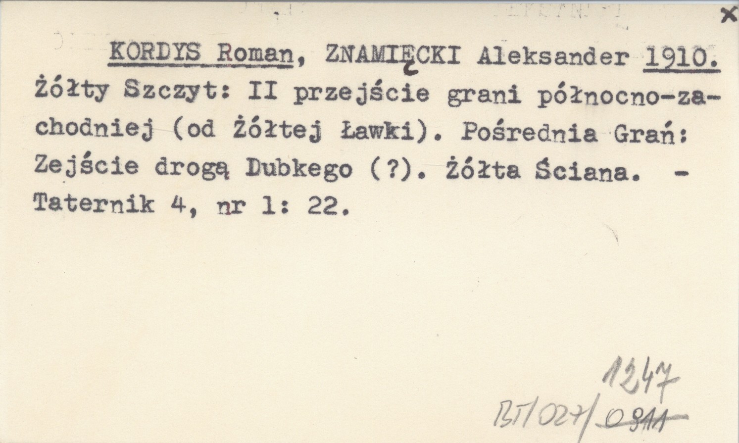 KORDYS Roman ZNAMIĘCKI, Aleksander. ; 1910 Żółty Szczyt: II przejście grani północno-zachodniej (od Żółtej Ławki). Pośrednia Grań: Zejście drogą Dubkego (?). Żółta Ściana.