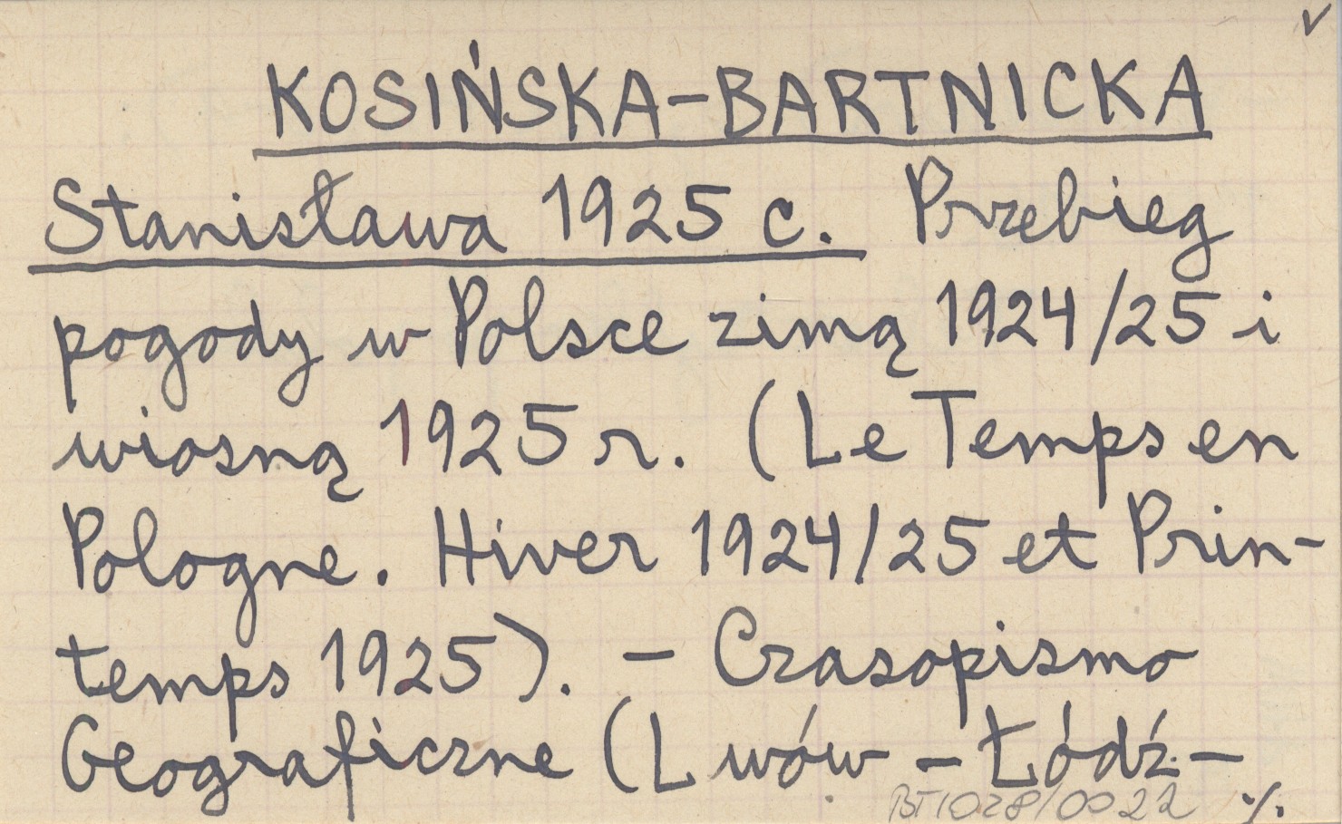 KOSIŃSKA-BARTNICKA Stanisława 1925 c Przebieg pogody w Polsce zimą 1924/25 i wiosną 1925 r. (Le Temps en Pologne. Hiver 1924/25 et Printemps 1925).