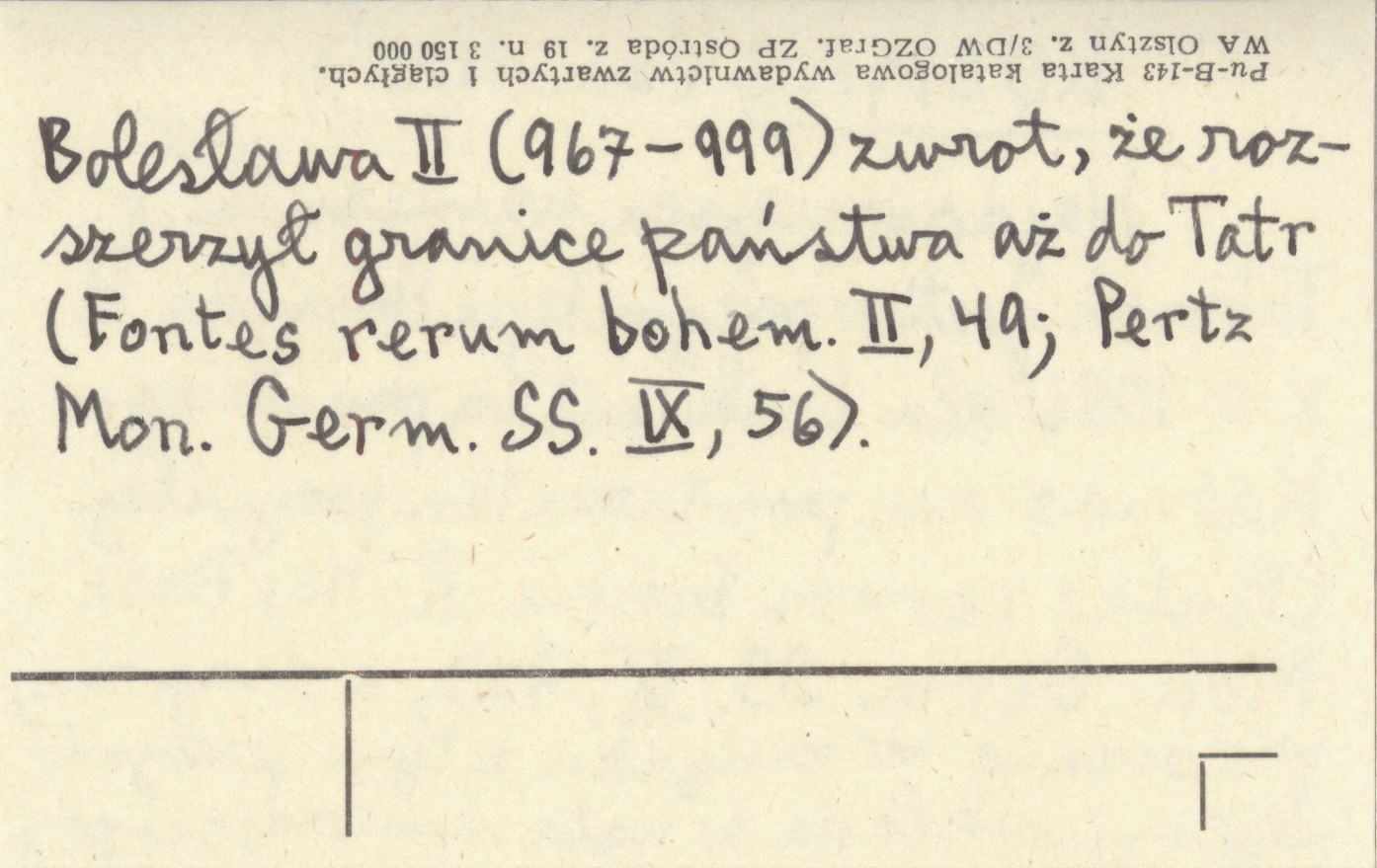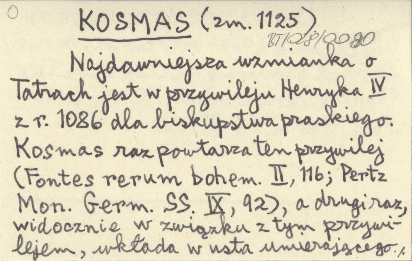 (zm. 1125) Najdawniejsza wzmianka o Tatrach jest w przywileju Henryka IV z r. 1086 dla biskupstwa praskiego. Kosmas raz powtarza ten przywilej (Fontes rerum bohem. II, 116; Pertz Mon. Germ. IX s., 92), a drugi raz, widocznie w związku z tym przywilejem, wkłada w usta umierającego Bolesława II (967-999) zwrot, że rozszerzył granice państwa aż do Tatr (Fontes rerum bohem. II, 49; Pertz Mon. Germ. IX s., 56).