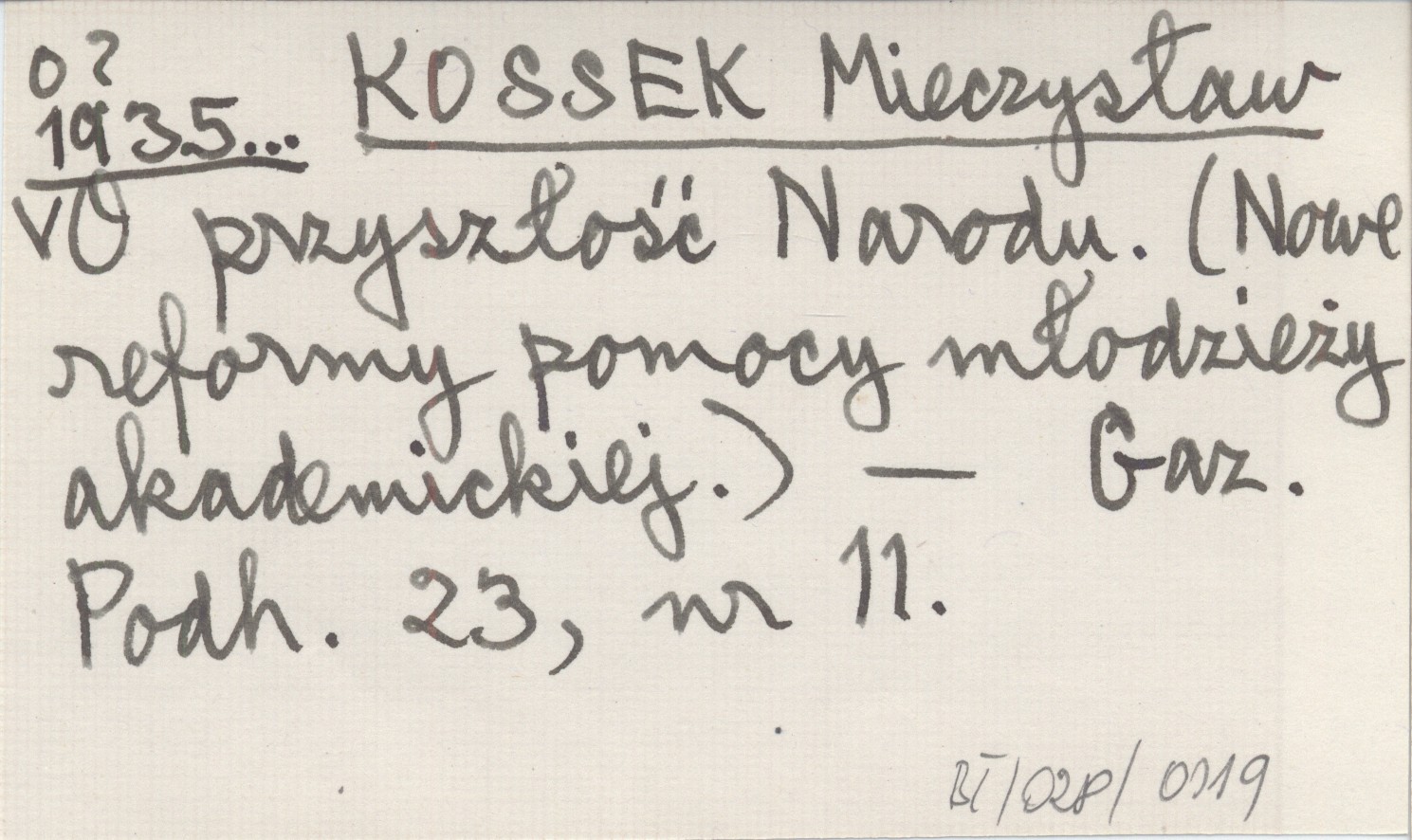KOSSEK Mieczysław 1935... O przyszłość Narodu. (Nowe reformy pomocy młodzieży akademickiej.).