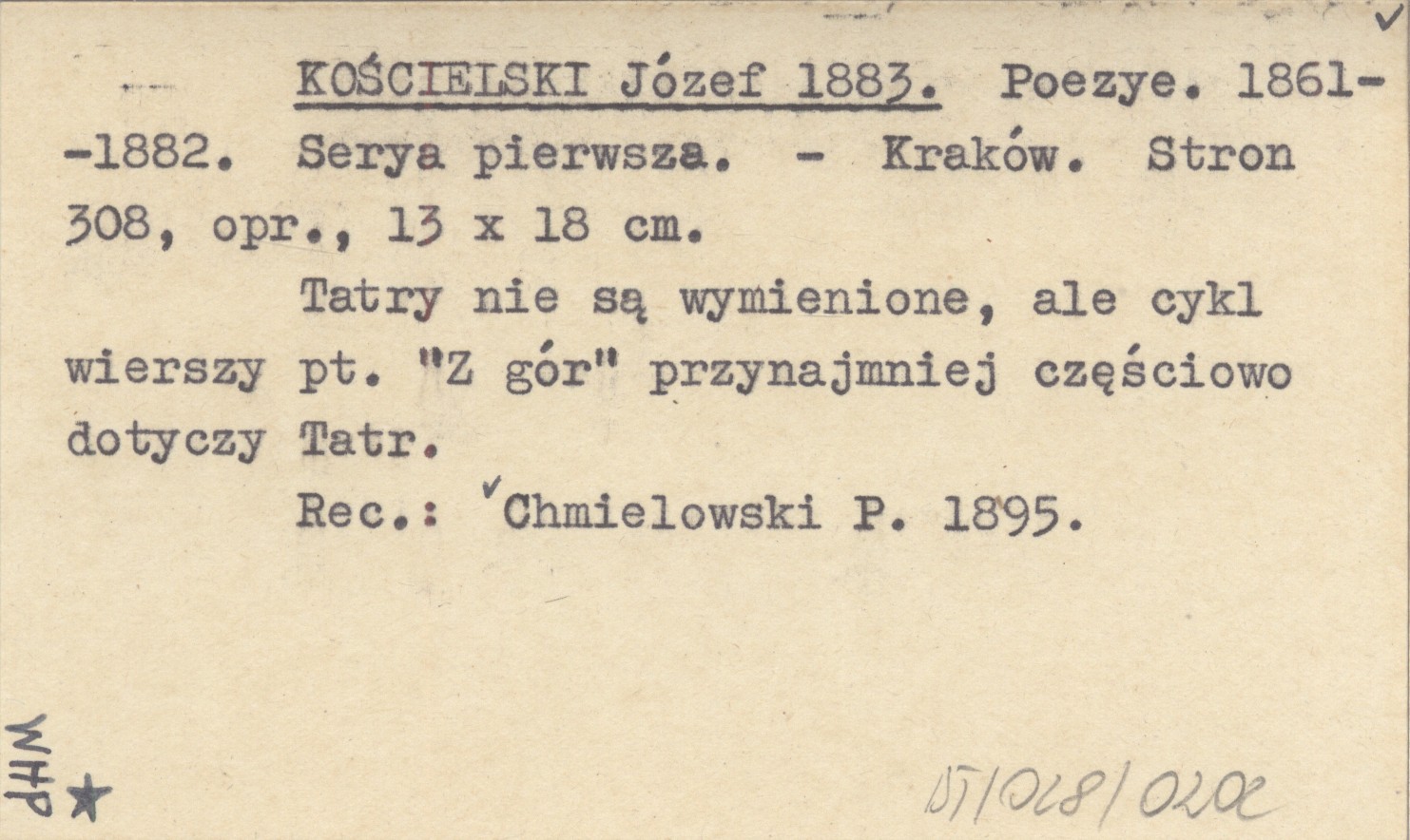 Kraków , 308 s., opr., 13x18 cm. Tatry nie są wymienione, ale cykl wierszy pt. "Z gór" przynajmniej częściowo dotyczy Tatr. REC: CHMIELOWSKI P. 1895
