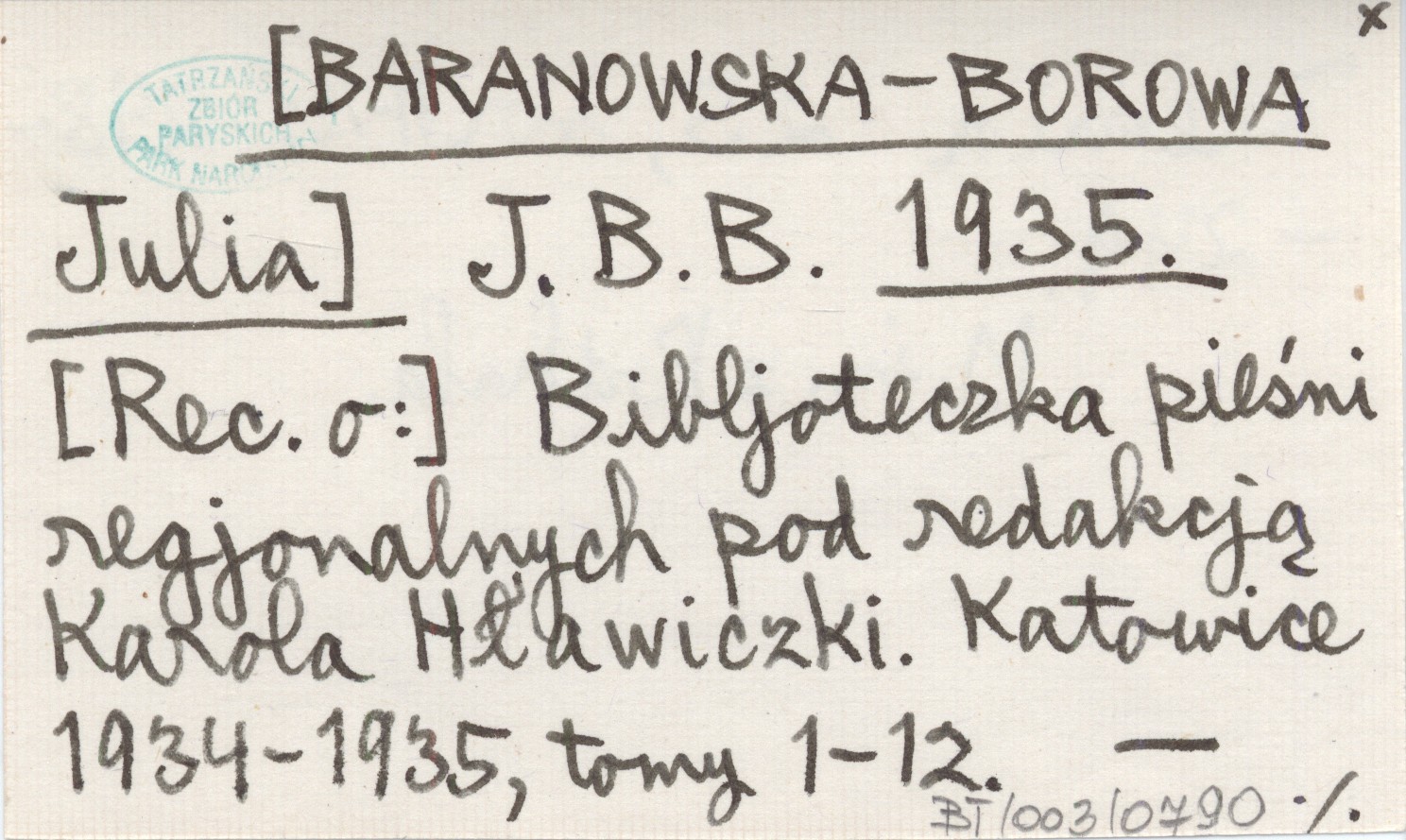 J. B. B. [BARANOWSKA-BOROWA Julia] 1935 Bibljoteczka pieśni regjonalnych pod redakcją Karola Hławiczki. Katowice 1934-1935, t. 1-12.