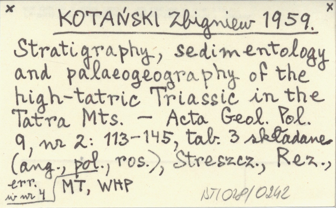 KOTAŃSKI Zbigniew 1959 Stratigraphy, sedimentology and palaeogeography of the high-tatric Triassic in the Tatra Mts.