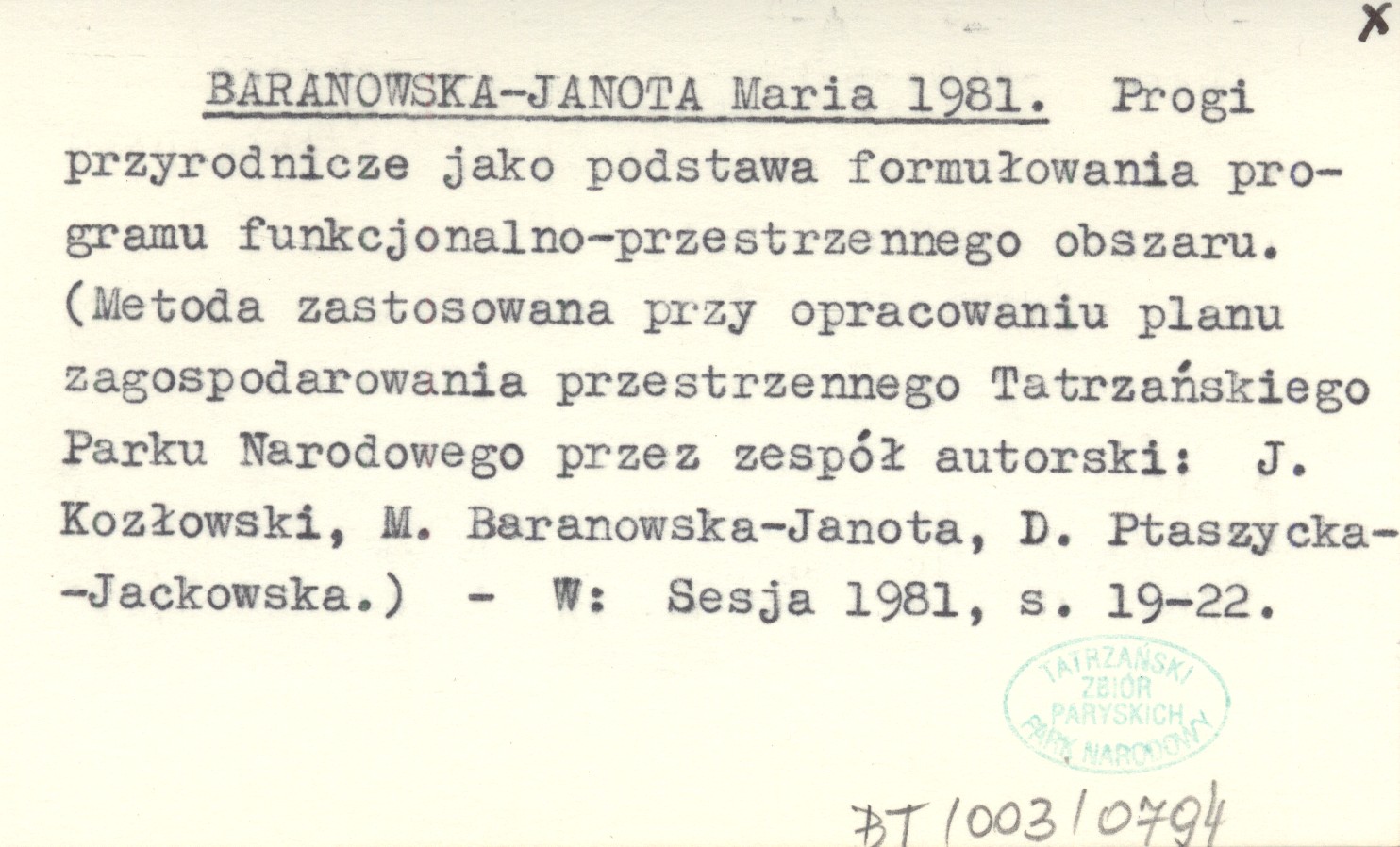 BARANOWSKA-JANOTA Maria 1981 Progi przyrodnicze jako podstawa formułowania programu funkcjonalno-przestrzennego obszaru. (Metoda zastosowana przy opracowaniu planu zagospodarowania przestrzennego Tatrzańskiego Parku Narodowego przez zespół autorski: J. Kozłowski, M. Baranowska-Janota, D. Ptaszycka-Jackowska).