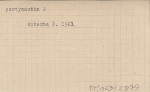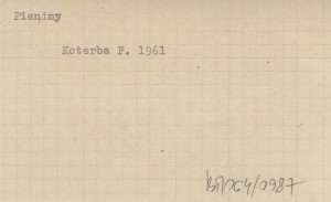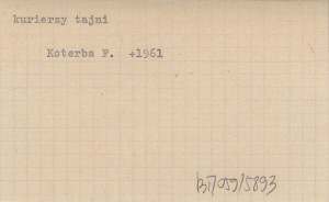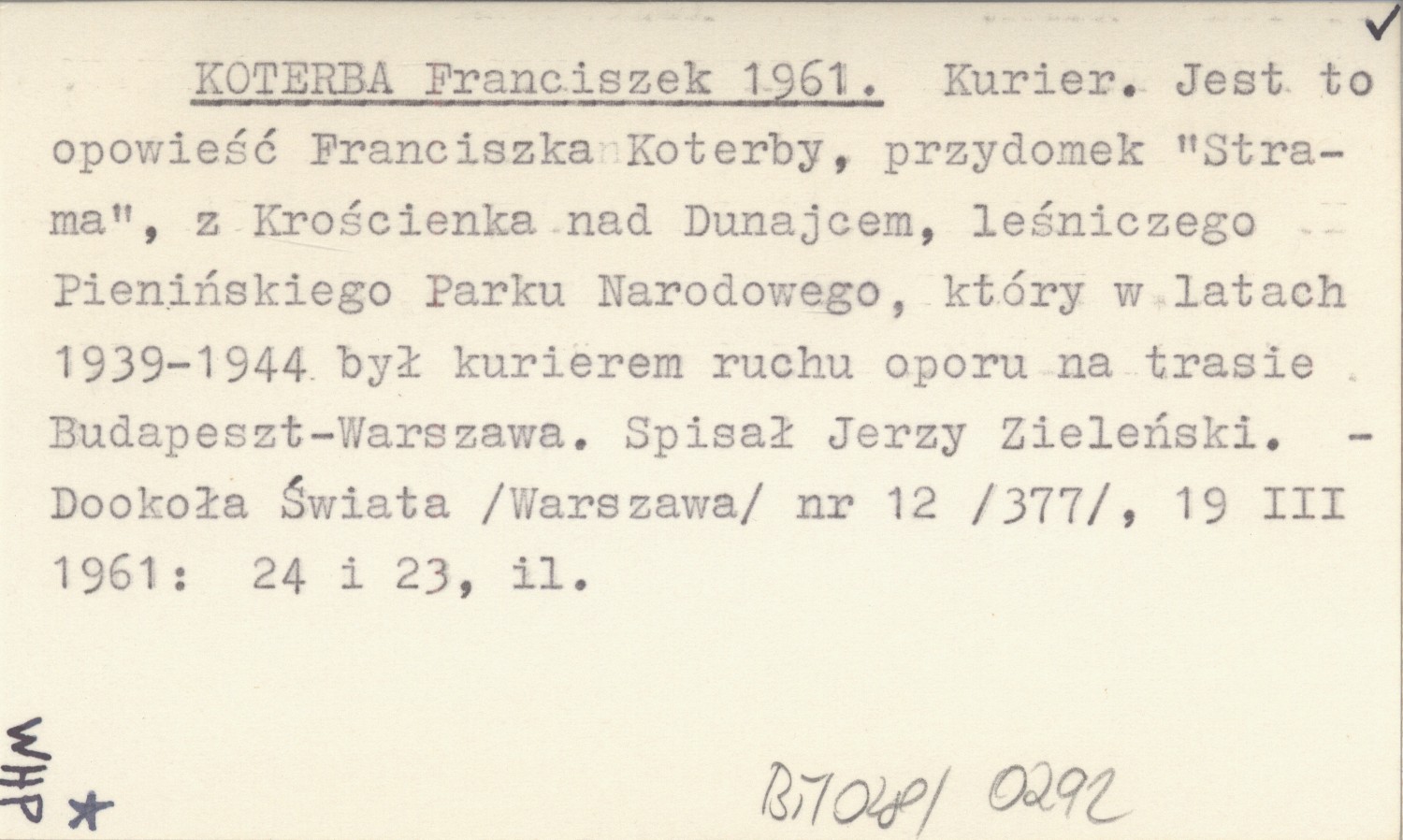 KOTERBA Franciszek 1961 Kurier. Jest to opowieść Franciszka Koterby, przydomek "Strama", z Krościenka nad Dunajcem, leśniczego Pienińskiego Parku Narodowego, który w latach 1939-1944 był kurierem ruchu oporu na trasie Budapeszt-Warszawa. Spisał Jerzy Zieliński.