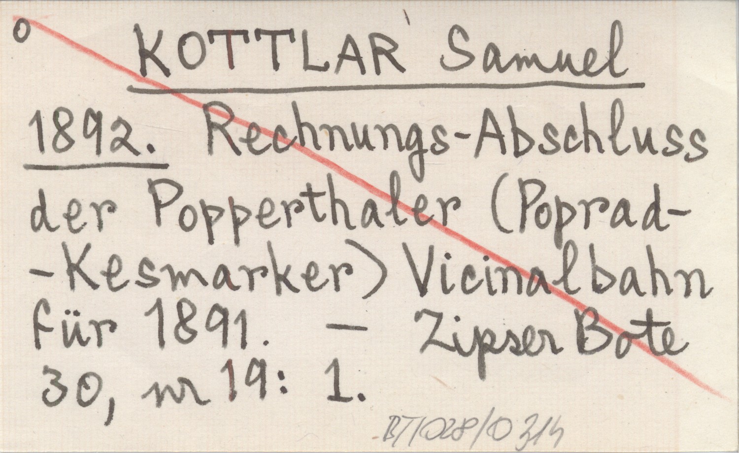 KOTTLAR Samuel 1892 Rechnungs-Abschluss der Popperthaler (Poprad-Kesmarker) Vicinalbahn für 1891.