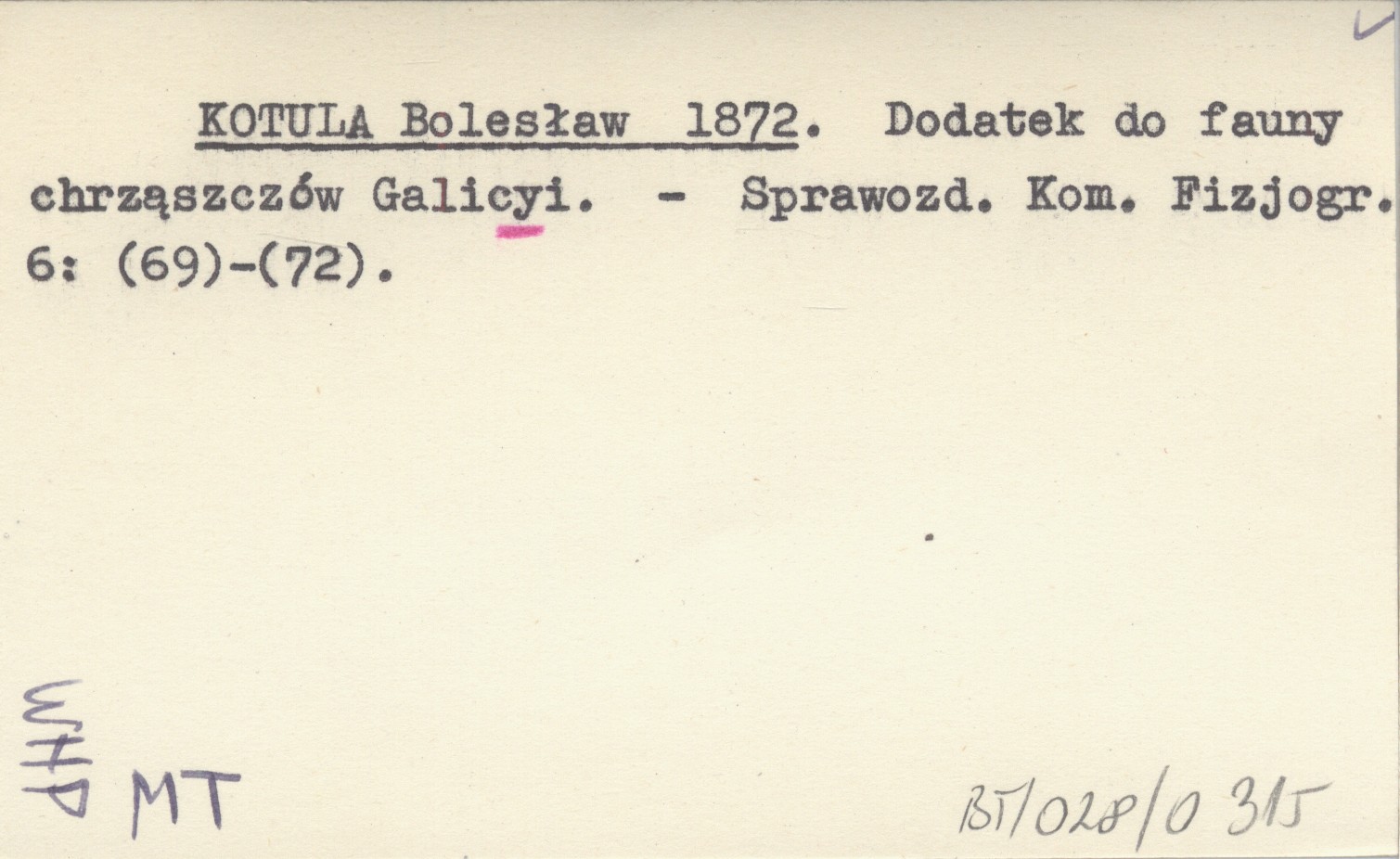 KOTULA Bolesław 1872 Dodatek do fauny chrząszczów Galicyi.