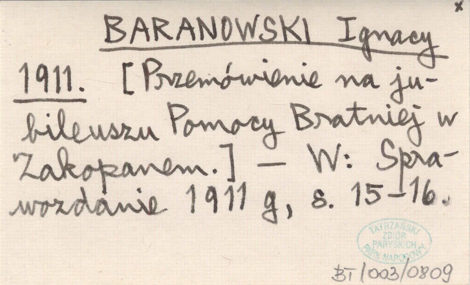 BARANOWSKI Ignacy 1911 [Przemówienie na jubileuszu Pomocy Bratniej w Zakopanem.]
