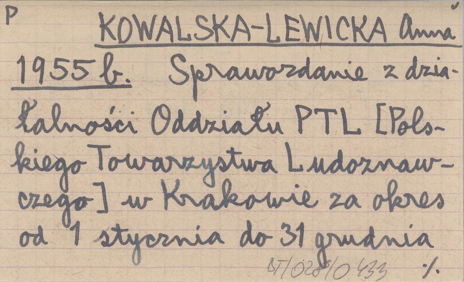 KOWALSKA-LEWICKA Anna 1955 b Sprawozdanie z działalności Oddziału PTL [Polskiego Towarzystwa Ludoznawczego] w Krakowie za okres od 1 stycznia do 31 grudnia 1954 r.