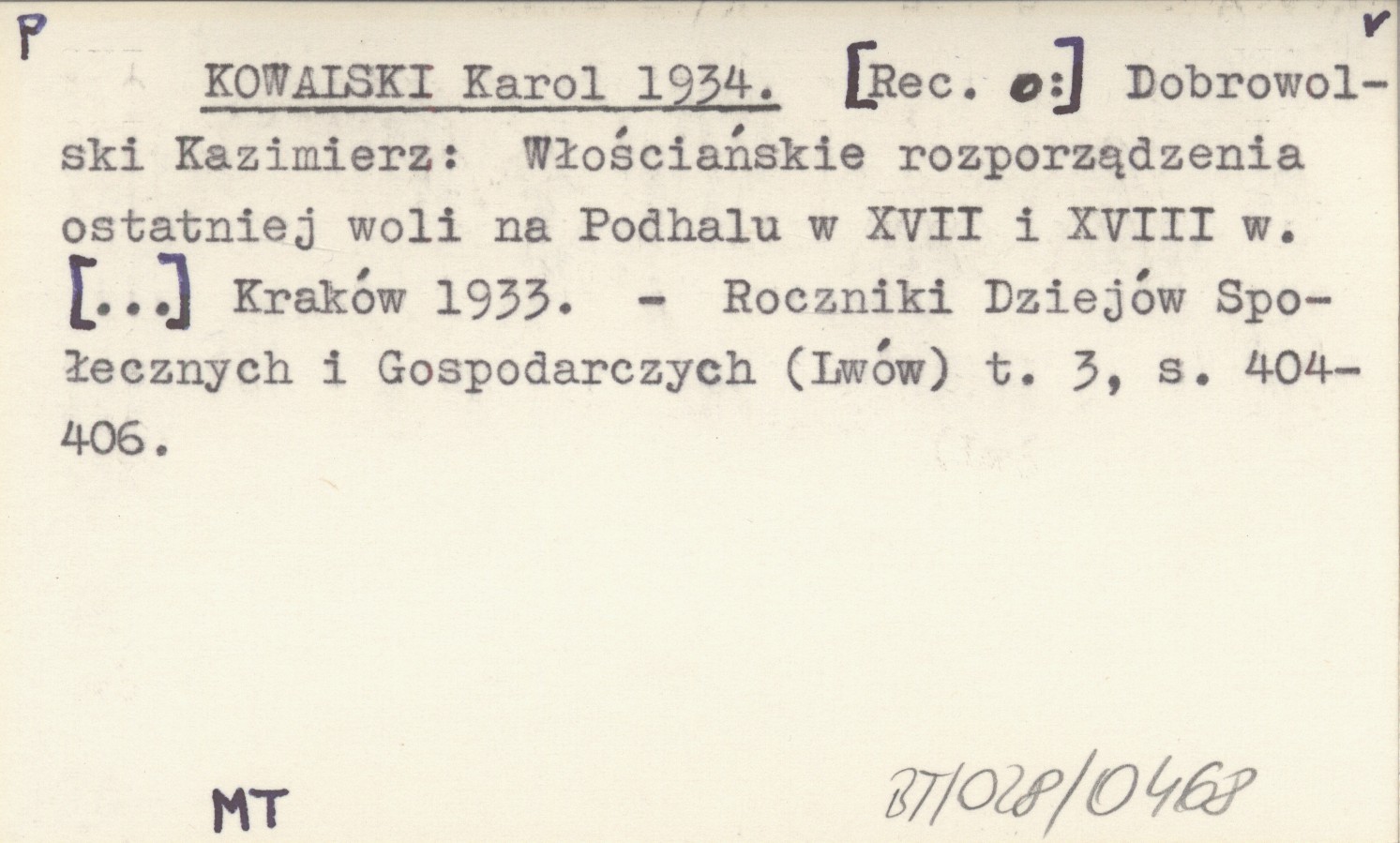 KOWALSKI Karol 1934 Dobrowolski Kazimierz: Włościańskie rozporządzenia ostatniej woli na Podhalu w XVII i XVIII w. [...] Kraków 1933.
