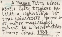 A Magas Tátra bércei között lelte tragikus halálát a legkiválóbb tátrai csúcsvezetö. Harmincöt méter magasságból zuhant le a hetvenhatéves Franc János. 1939...