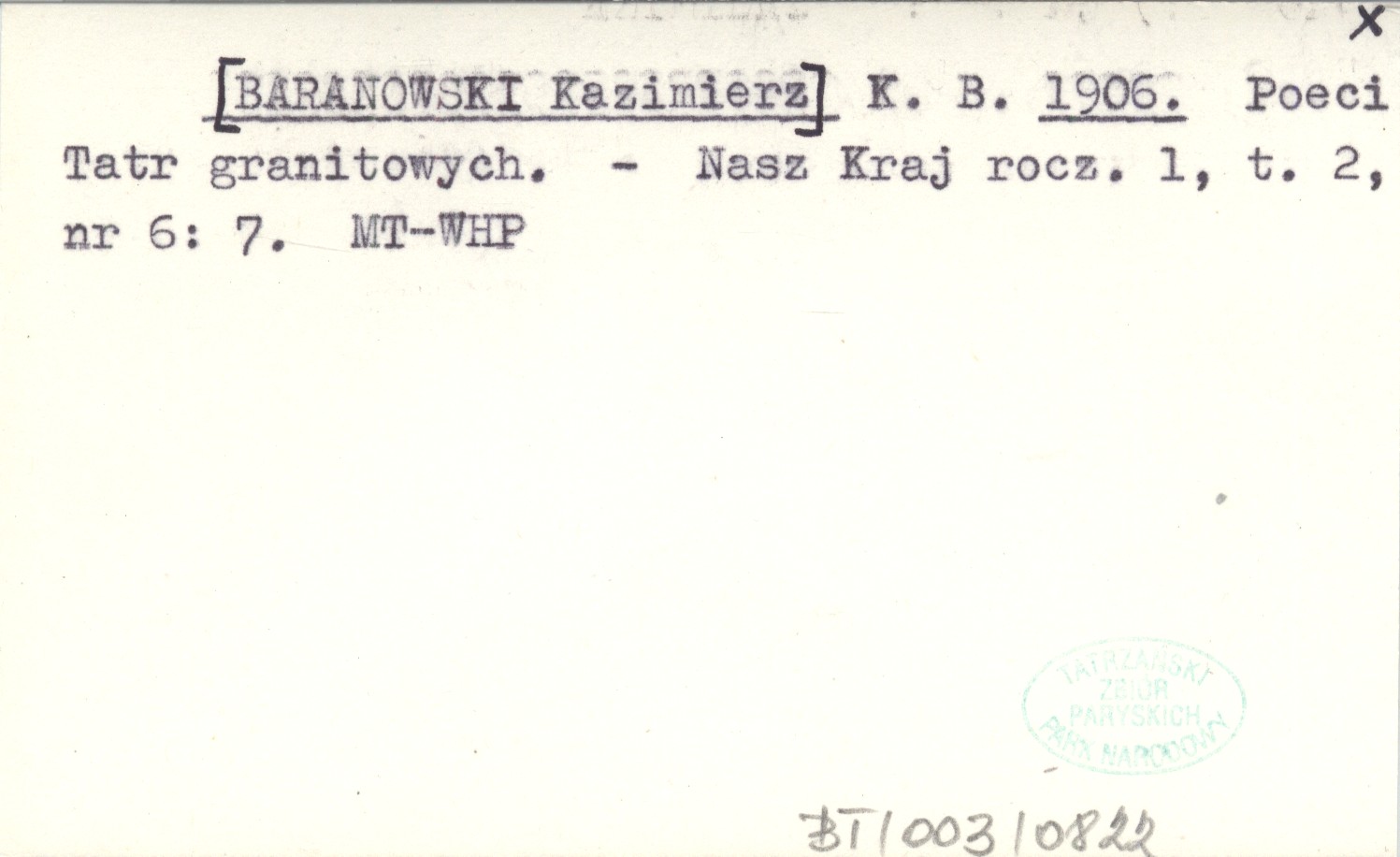 K. B. [BARANOWSKI Kazimierz] 1906 Poeci Tatr granitowych.