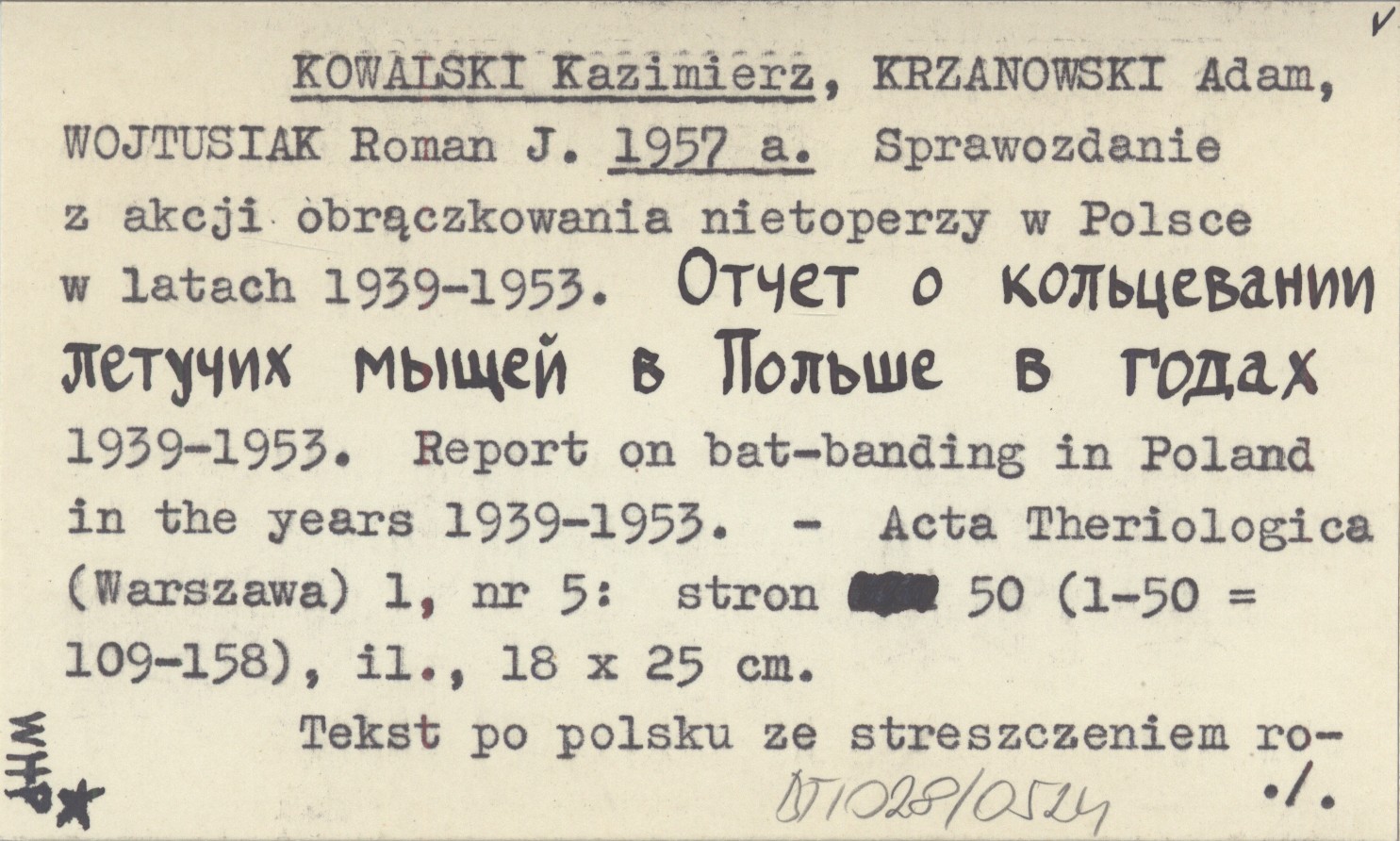 KOWALSKI Kazimierz KRZANOWSKI, Adam. ; WOJTUSIAK, Roman J. ; 1957 a Sprawozdanie z akcji obrączkowania nietoperzy w Polsce w latach 1939-1953. Otčet o kol'cevanii letučich myšej v Pol'še b godach 1939-1953. Report on bat-banding in Poland in the years 1939-1953.