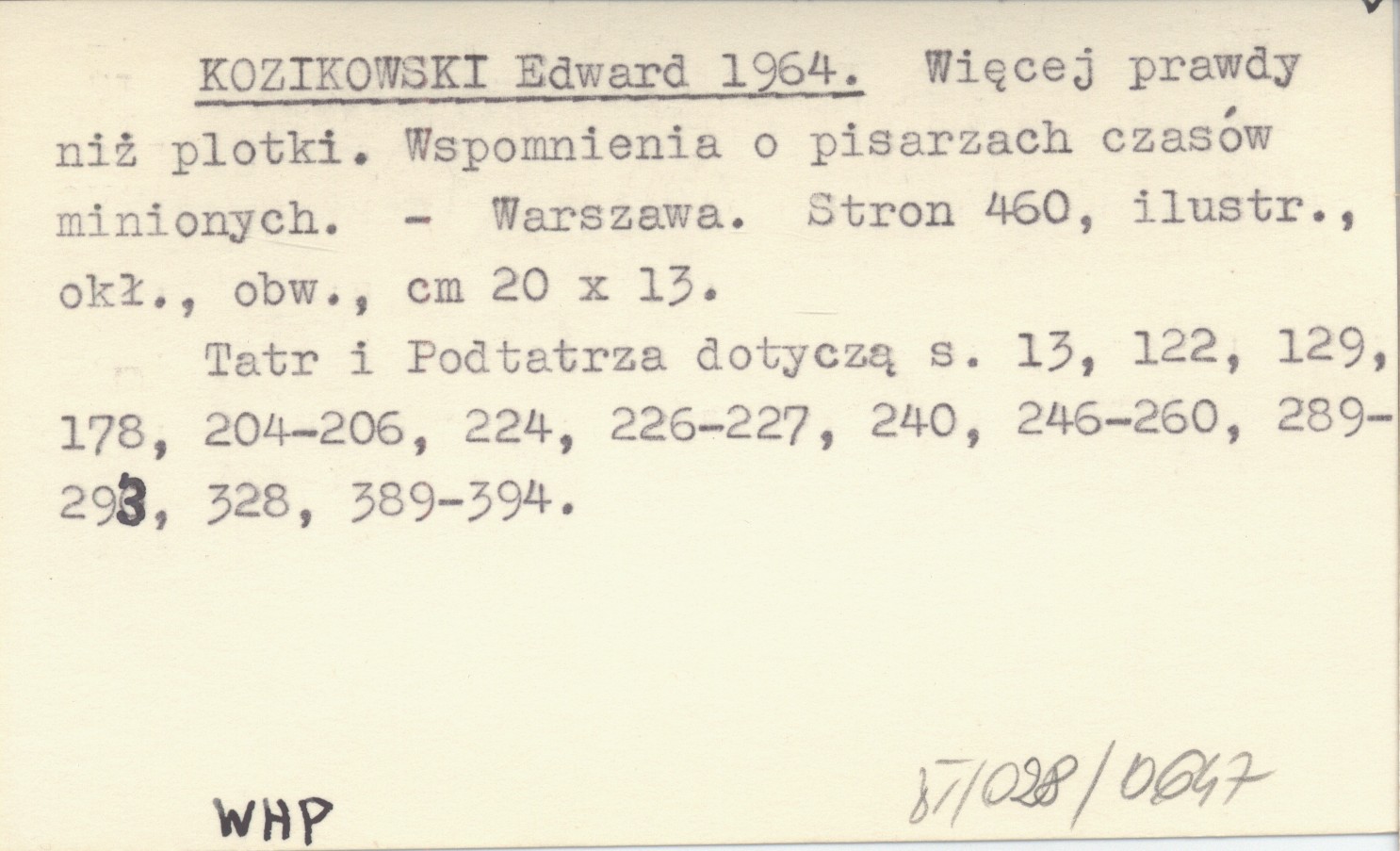 Warszawa , 460 s., il., okł., obw., 20x13 cm. Tatr i Podtatrza dotyczą s. 13, 122, 129, 178, 204-206, 224, 226-227, 240, 246-260, 289-293, 328, 389-394.