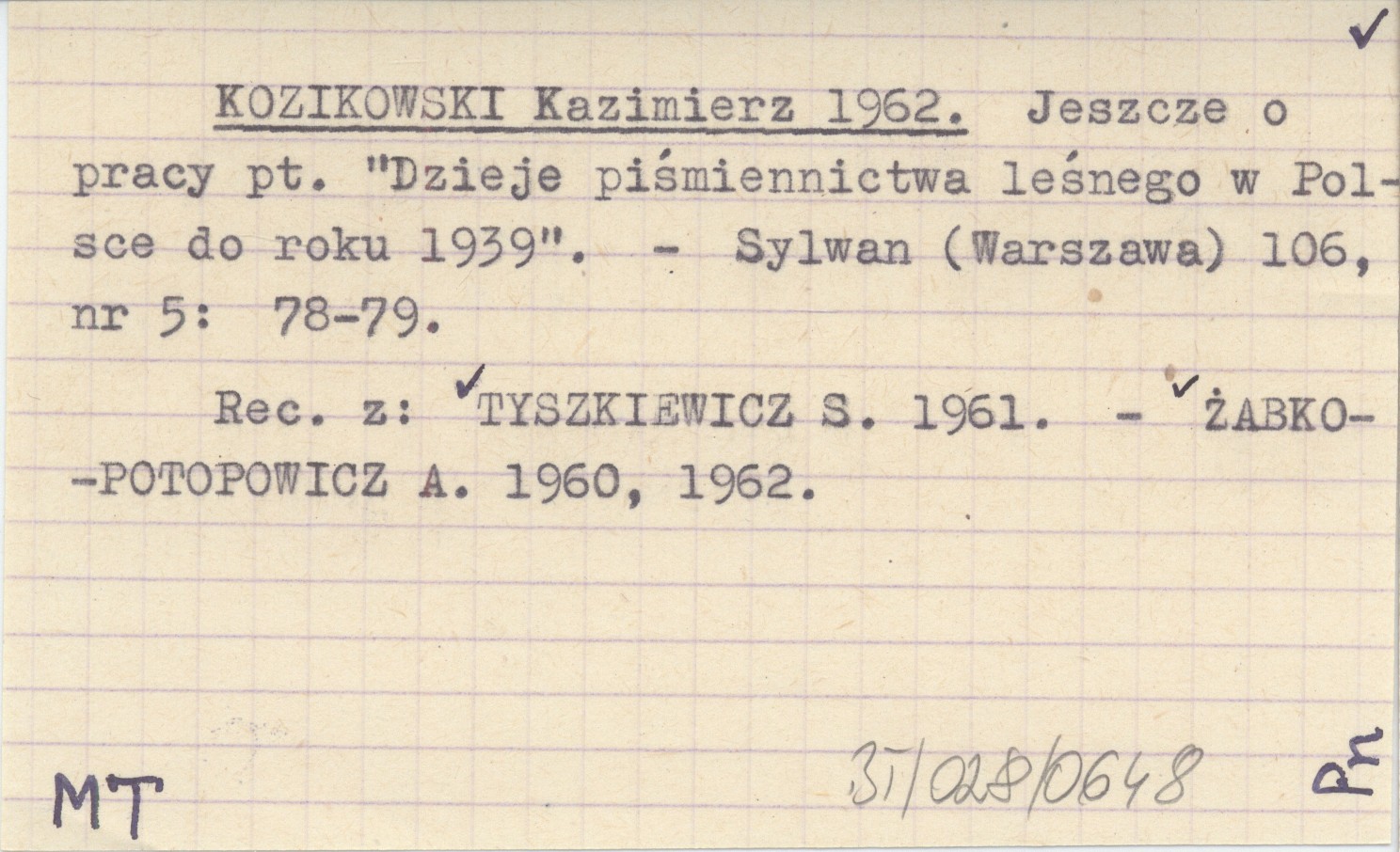 KOZIKOWSKI Kazimierz 1962 Jeszcze o pracy pt. "Dzieje piśmiennictwa leśnego w Polsce do roku 1939".