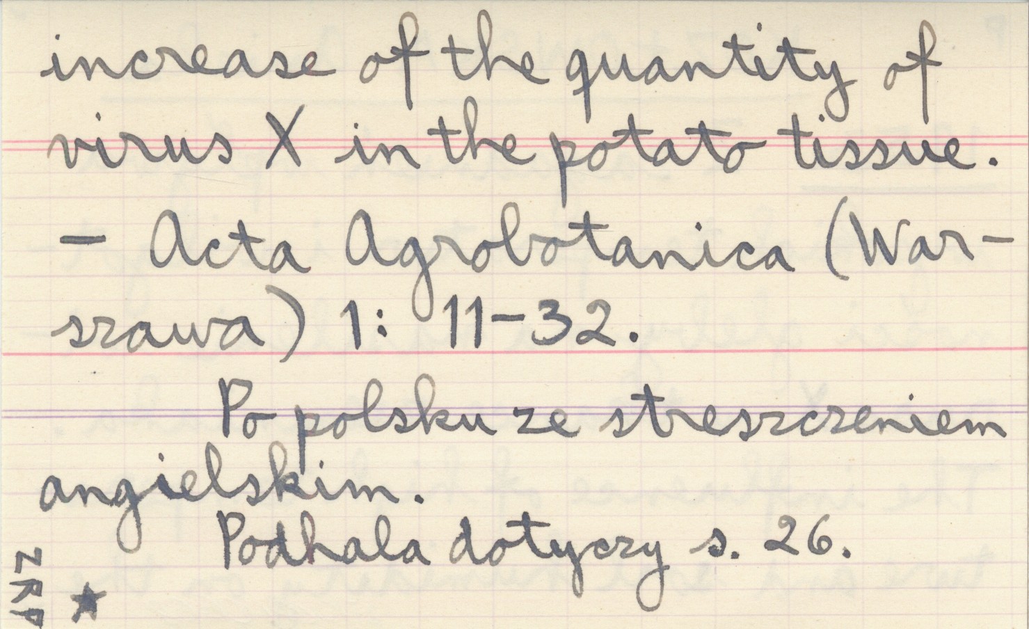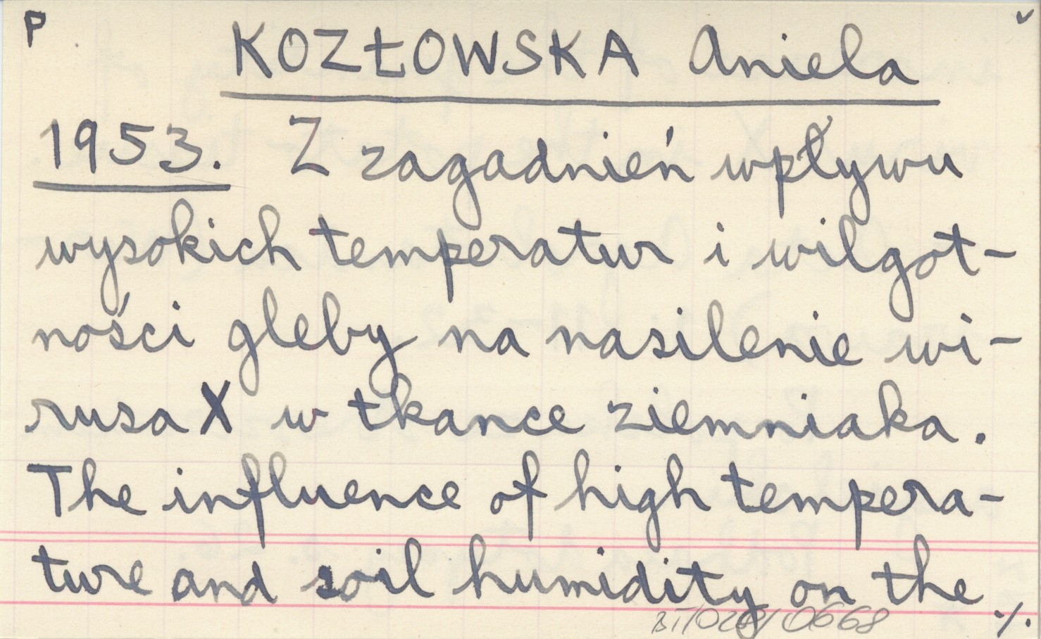 KOZŁOWSKA Aniela 1953 Z zagadnień wpływu wysokich temperatur i wilgotności gleby na nasilenie wirusa X w tkance ziemniaka. The influence of high temperature and soil humidity on the increase of the quantity of virus X in the potato tissue.