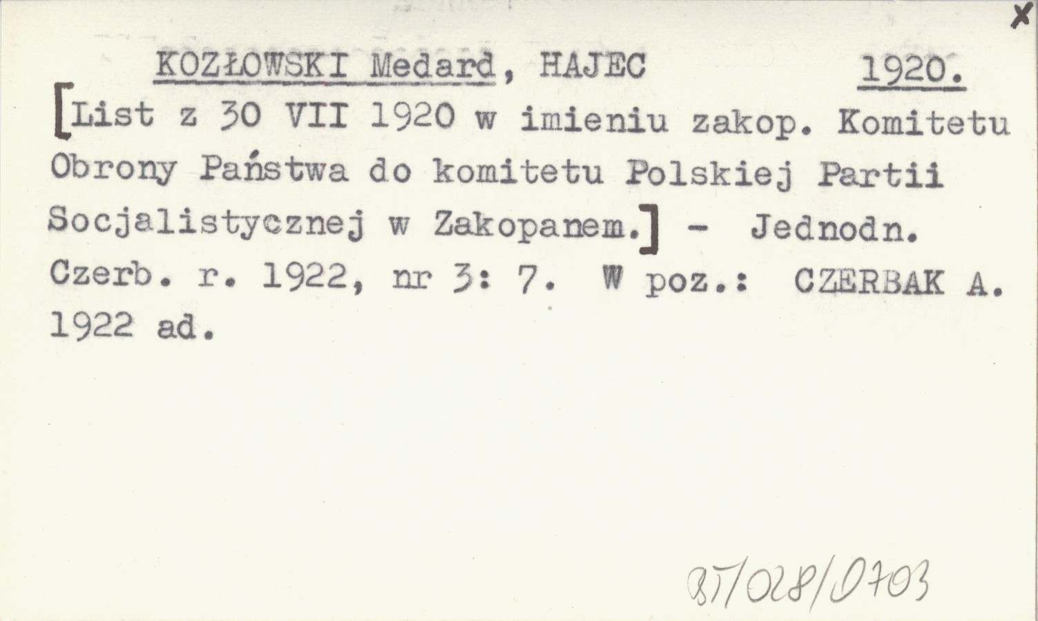 KOZŁOWSKI Medard HAJEC ; 1920 [List z 30 VII 1920 w imieniu zakop. Komitetu Obrony Państwa do komitetu Polskiej Partii Socjalistycznej w Zakopanem.].