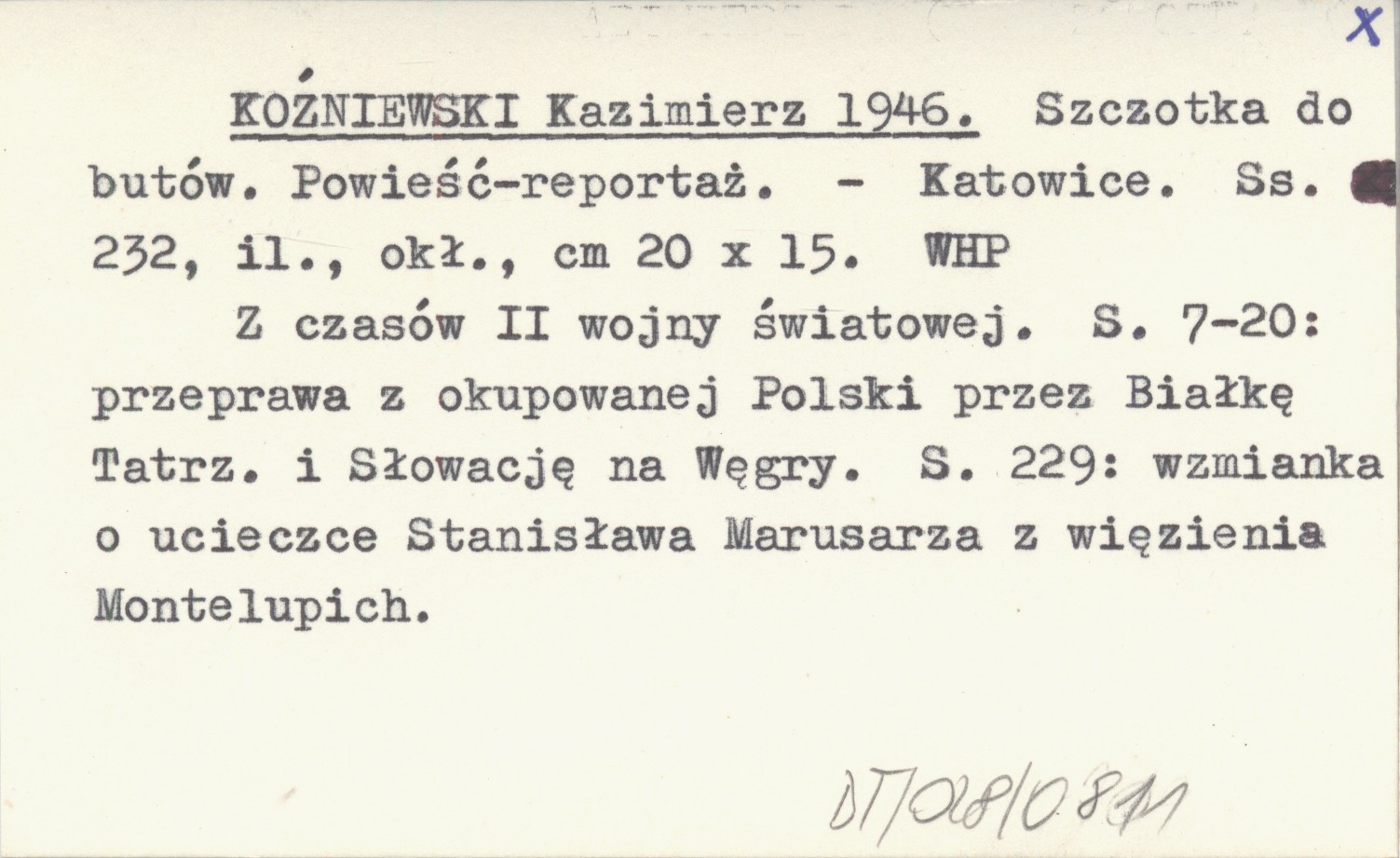 Katowice , 232 s., il., okł., 20x15 cm. Z czasów II wojny światowej. S. 7-20: przeprawa z okupowanej Polski przez Białkę Tatrz. i Słowację na Węgry. S. 229: wzmianka o ucieczce Stanisława Marusarza z więzienia Montelupich.