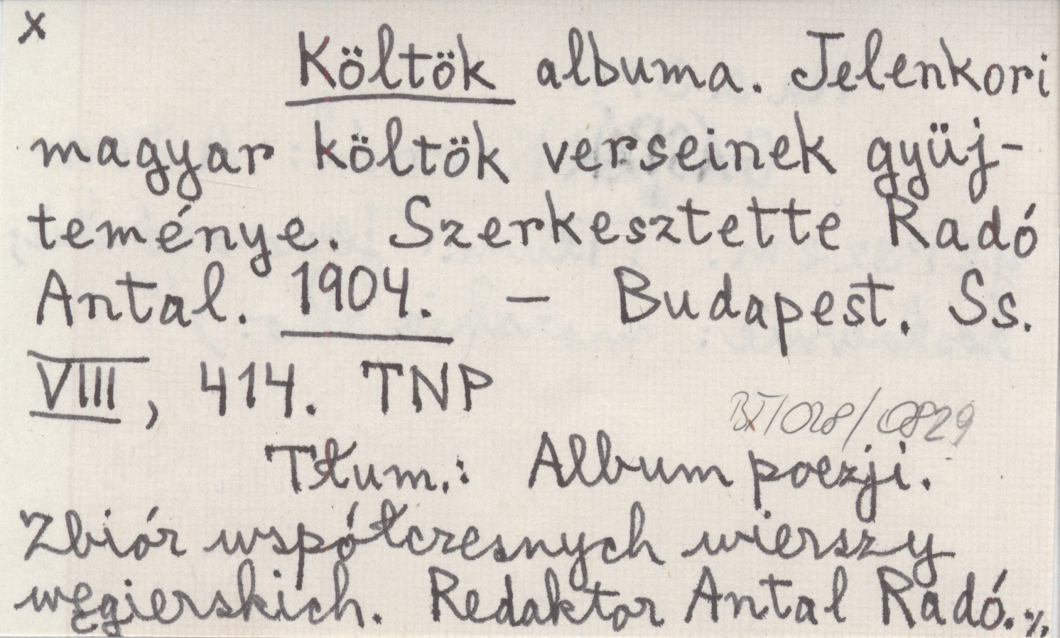 Költök albuma. Jelenkori magyar költök verseinek gyüjteménye. Szerkesztette Radó Antal. 1904
