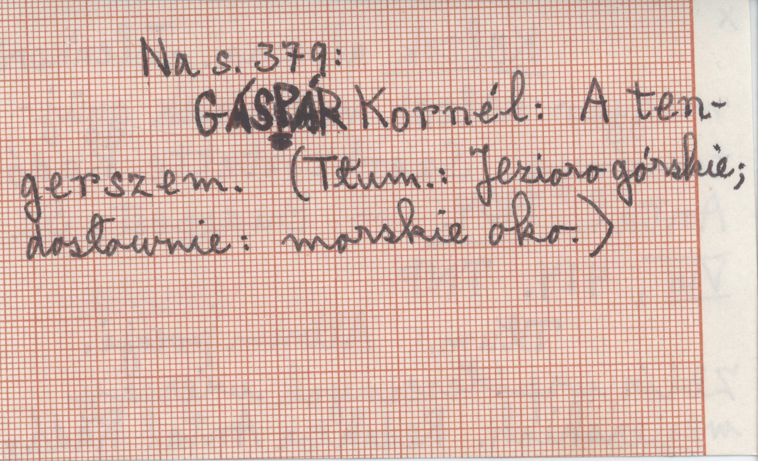 Budapest , 8 s., 414. Na s. 379: GÁSPÁR Kornél: A tengerszem. (Tłum.: Jezioro górskie; dosłownie: morskie oko.) Tłum.: Album poezji. Zbiór współczesnych wierszy węgierskich. Redaktor Antal Radó.