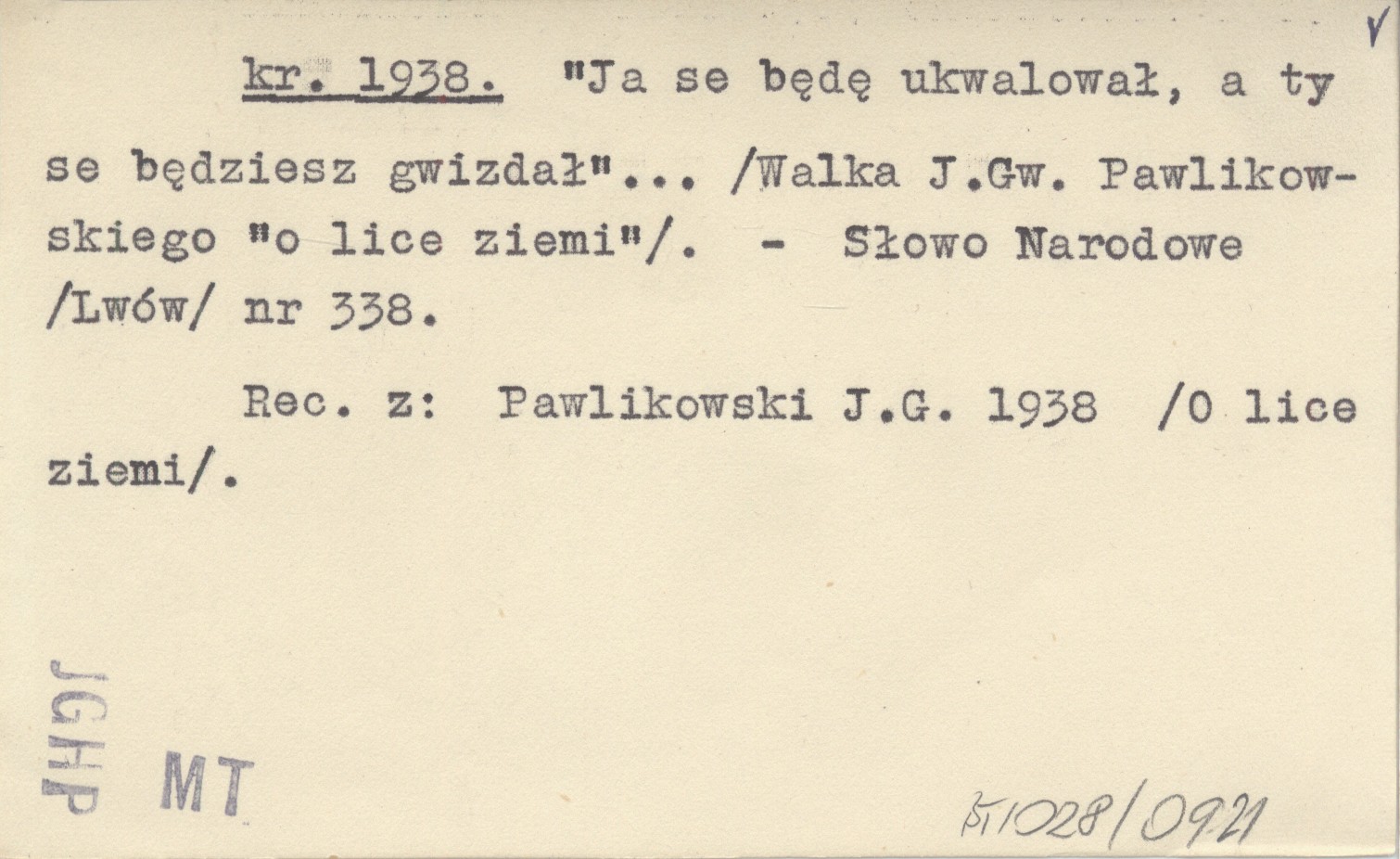 kr. 1938 "Ja se będę ukwalował, a ty se będziesz gwizdał"... (Walka J.Gw. Pawlikowskiego "o lice ziemi").