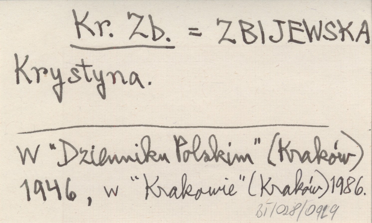 Kr. Zb. ZBIJEWSKA Krystyna W "Dzienniku Polskim" (Kraków) 1946, w "Krakowie" (Kraków) 1986.