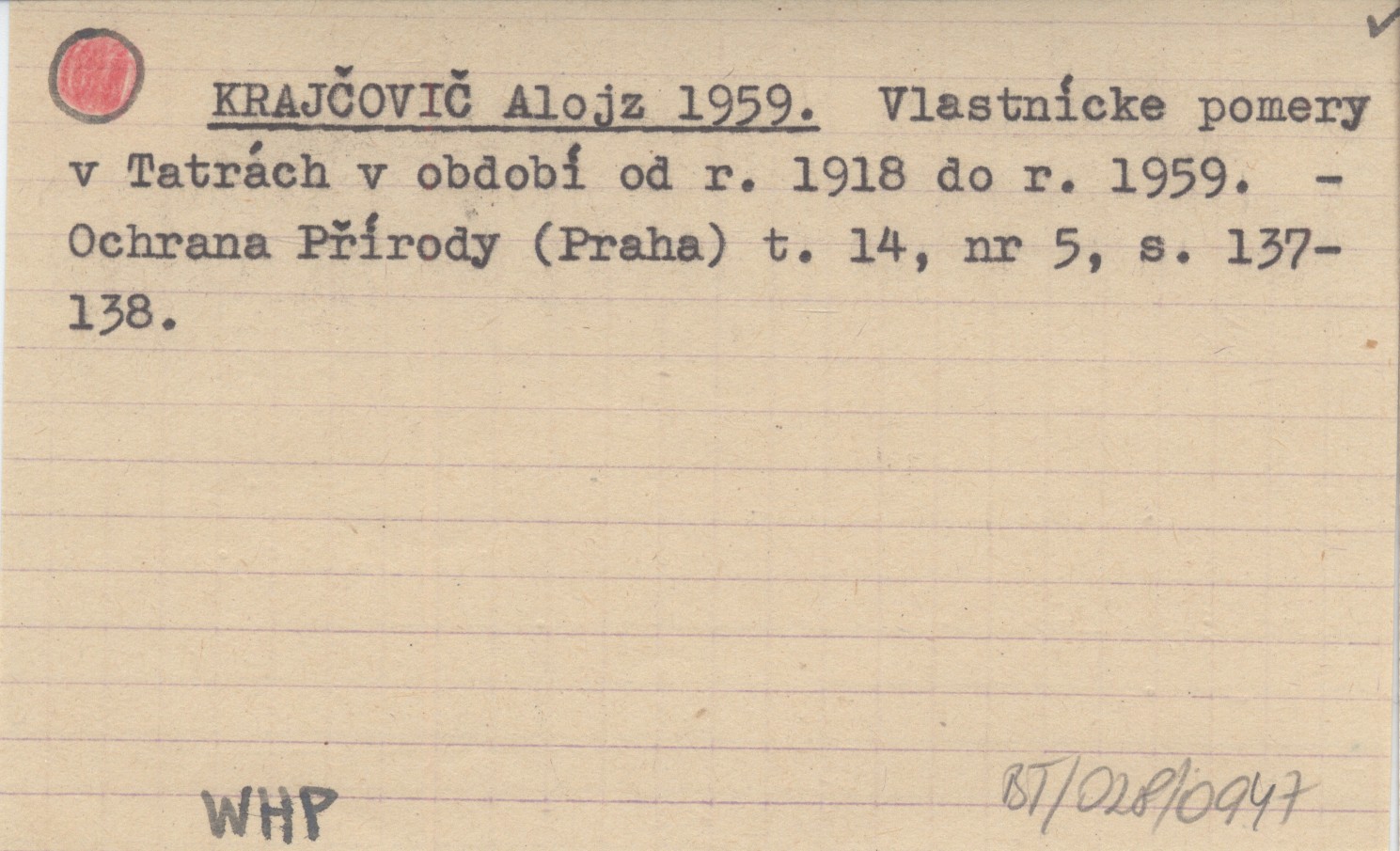 KRAJČOVIČ Alojz 1959 Vlastnícke pomery v Tatrách v období od r. 1918 do r. 1959.
