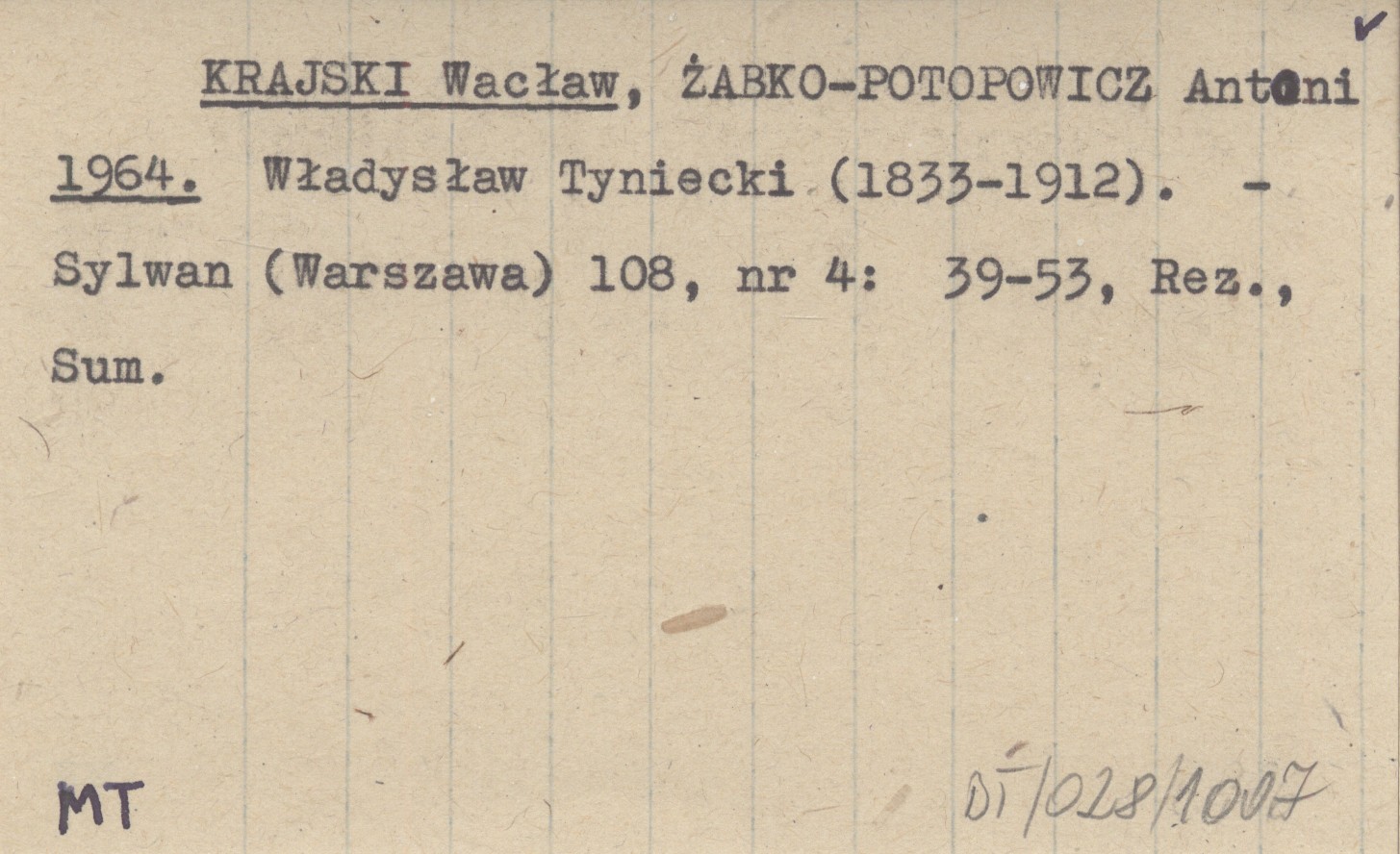 KRAJSKI Wacław ŻABKO-POTOPOWICZ, Antoni. ; 1964 Władysław Tyniecki (1833-1912).