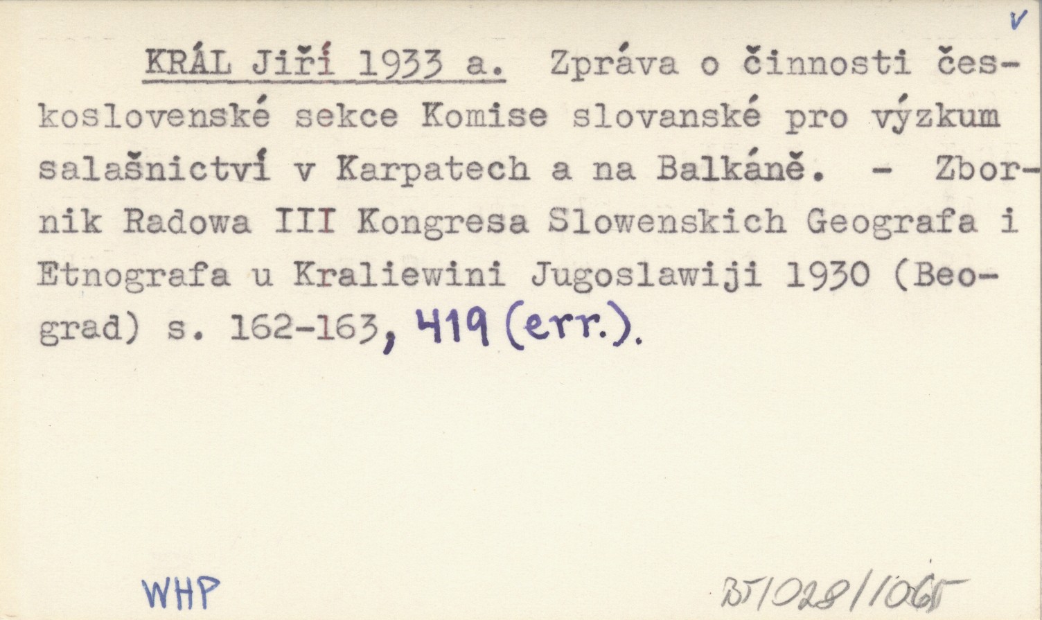 KRÁL Jiří 1933 a Zpráva o činnosti československé sekce Komise slovanské pro výzkum salaąnictví v Karpatech a na Balkáně.