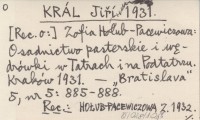 KRÁL Jiří 1931 Zofia Hołub-Pacewiczowa: Osadnictwo pasterskie i wędrówki w Tatrach i na Podtatrzu. Kraków 1931.