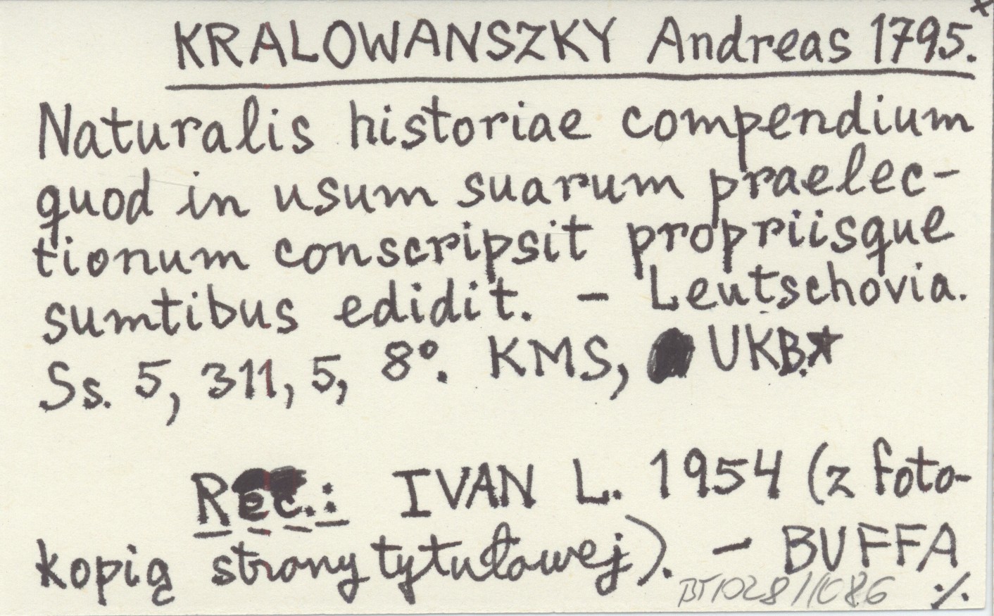 KRALOWANSZKY Andreas 1795 Naturalis historiae compendium quod in usum suarum praelectionum conscripsit propriisque sumtibus edidit.