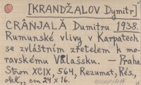 [KRAND®ALOV Dymitr] CRÂNJALÃ, Dumitru. ; 1938 Rumunské vlivy v Karpatech se zvlá¹tním zøetelem k moravskému Vala¹sku.