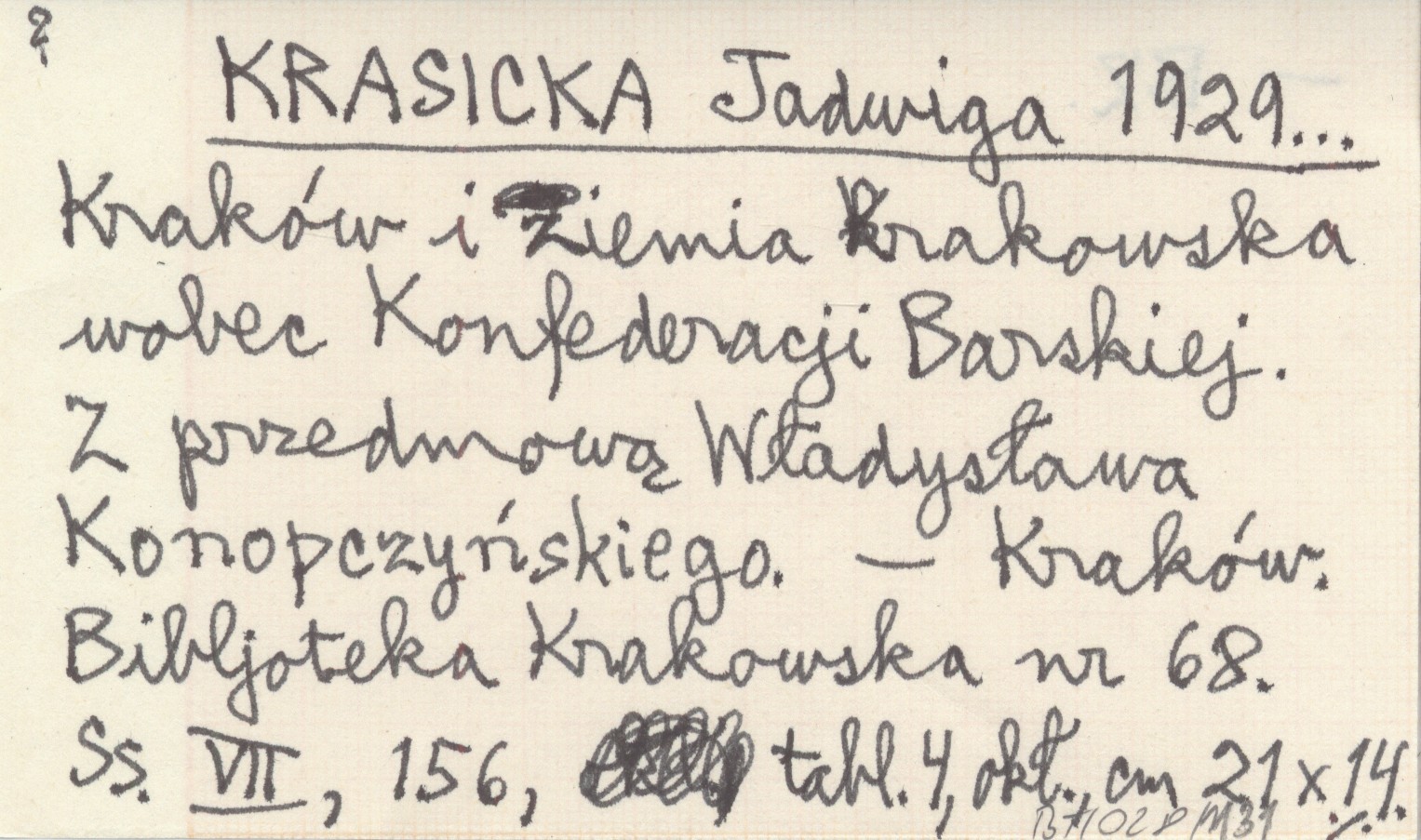 KRASICKA Jadwiga 1929... Kraków i ziemia Krakowska wobec Konfederacji Barskiej. Z przedmową Władysława Konopczyńskiego.
