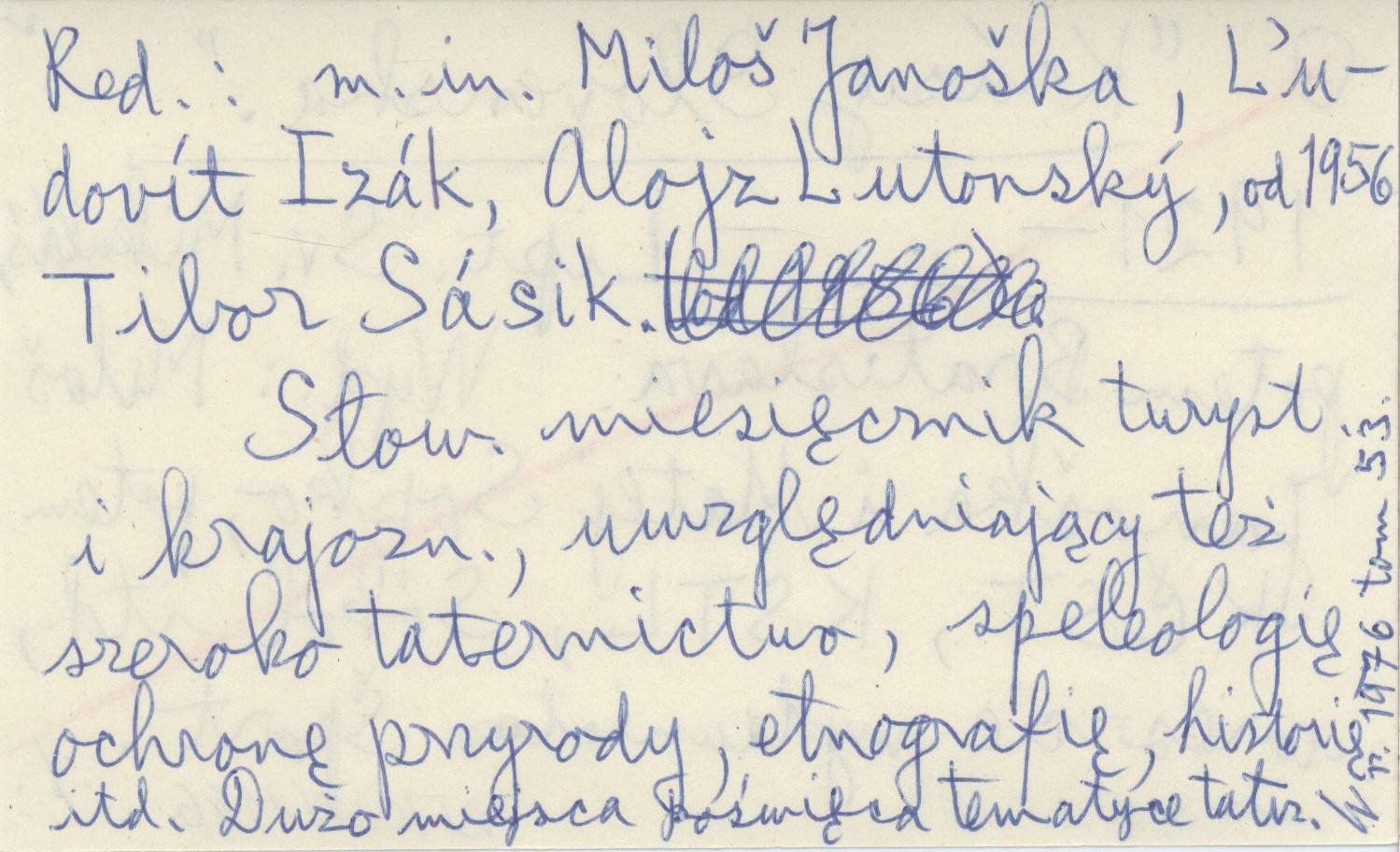 Miloš Janoška i Matej Sopko ; KČST ; KSTL ; Sokol ; Šport ; Krásy Slovenska (Lipt. Sv. Mikuláš ; Bratislava ;) , 1921- . Słow. miesięcznik turyst. i krajozn., uwzględniający też szeroko taternictwo, speleologię, ochronę przyrody, etnografię, historię itd. Dużo miejsca poświęca tematyce tatrz. Red. m.in. Miloš Janoška, Ľudovít Izák, Alojz Lutonský, od 1956 Tibor Sásik. W r. 1976 tom 53.