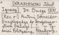 Dr. Omega [KRASZEWSKI Józef Ignacy] 1871... [Rec. o:] Antoni Schneider: Encyklopedya do krajoznawstwa Galicyi [...].
