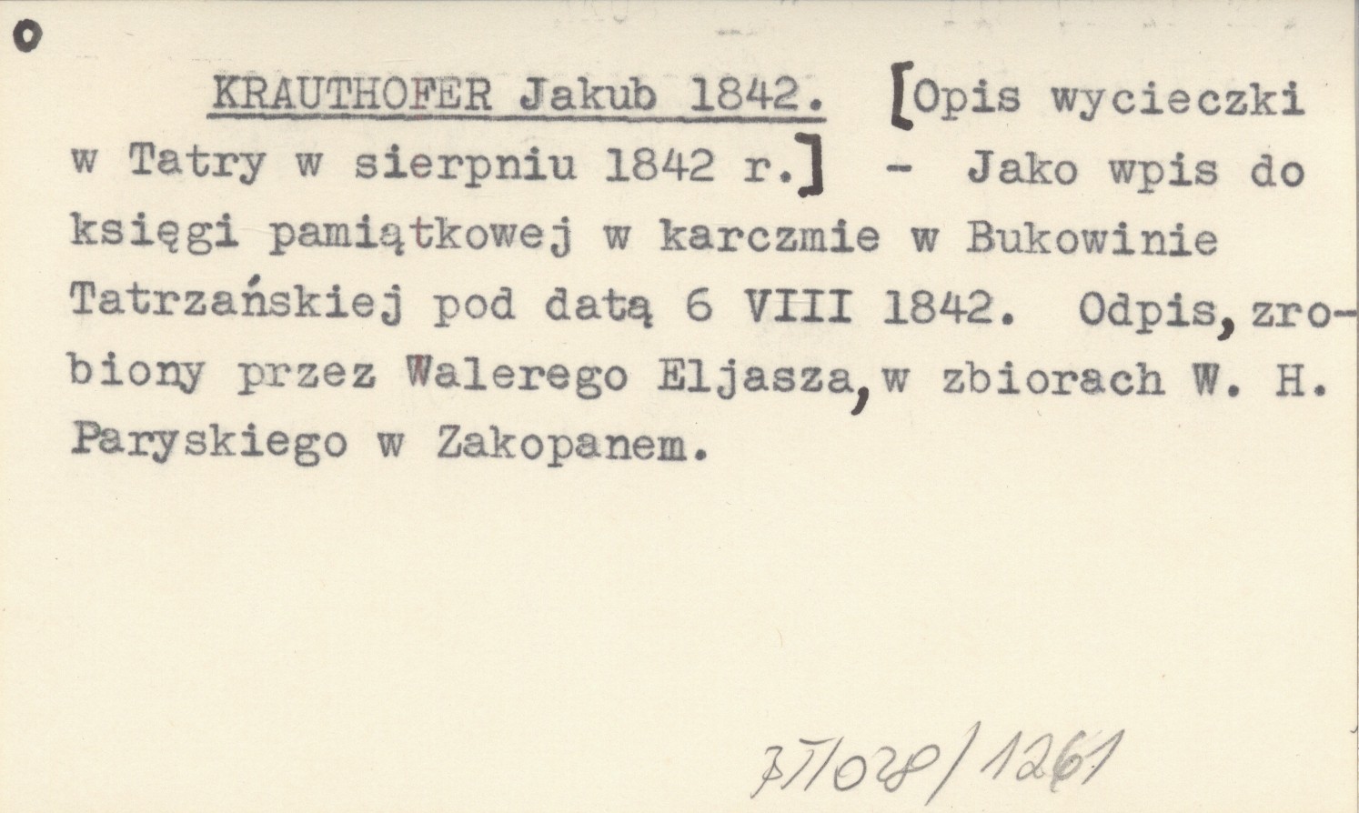 , Jako wpis do księgi pamiątkowej w karczmie w Bukowinie Tatrzańskiej pod datą 6 VIII 1842. Odpis, zrobiony przez Walerego Eljasza, w zbiorach W. H. Paryskiego w Zakopanem.