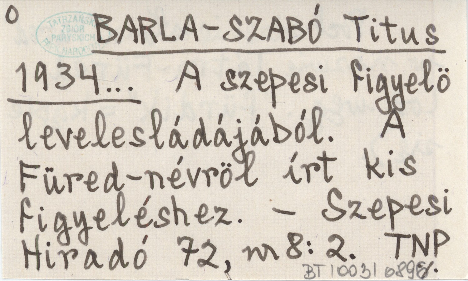 BARLA-SZABÓ Titus 1934... A szepesi figyelö levelesládájából. A Füred-névröl írt kis figyeléshez.