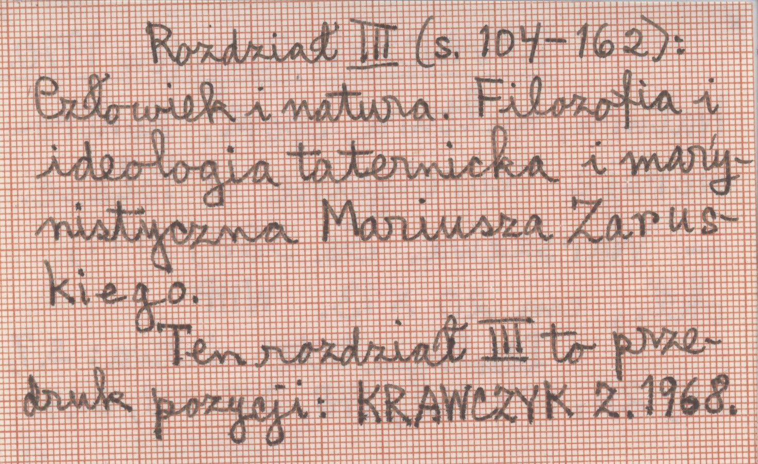 Warszawa , 388 s., err., okł., 20x13 cm. Ideologia taternictwa: s. 7, 25, 26, 104-162, 178, 317-318, 327. Rozdział III (s. 104-162): Człowiek i natura. Filozofia i ideologia taternicka i marynistyczna Mariusza Zaruskiego. Ten rozdział III to przedruk pozycji: KRAWCZYK Z. 1968. KRAWCZYK Z. 1968.