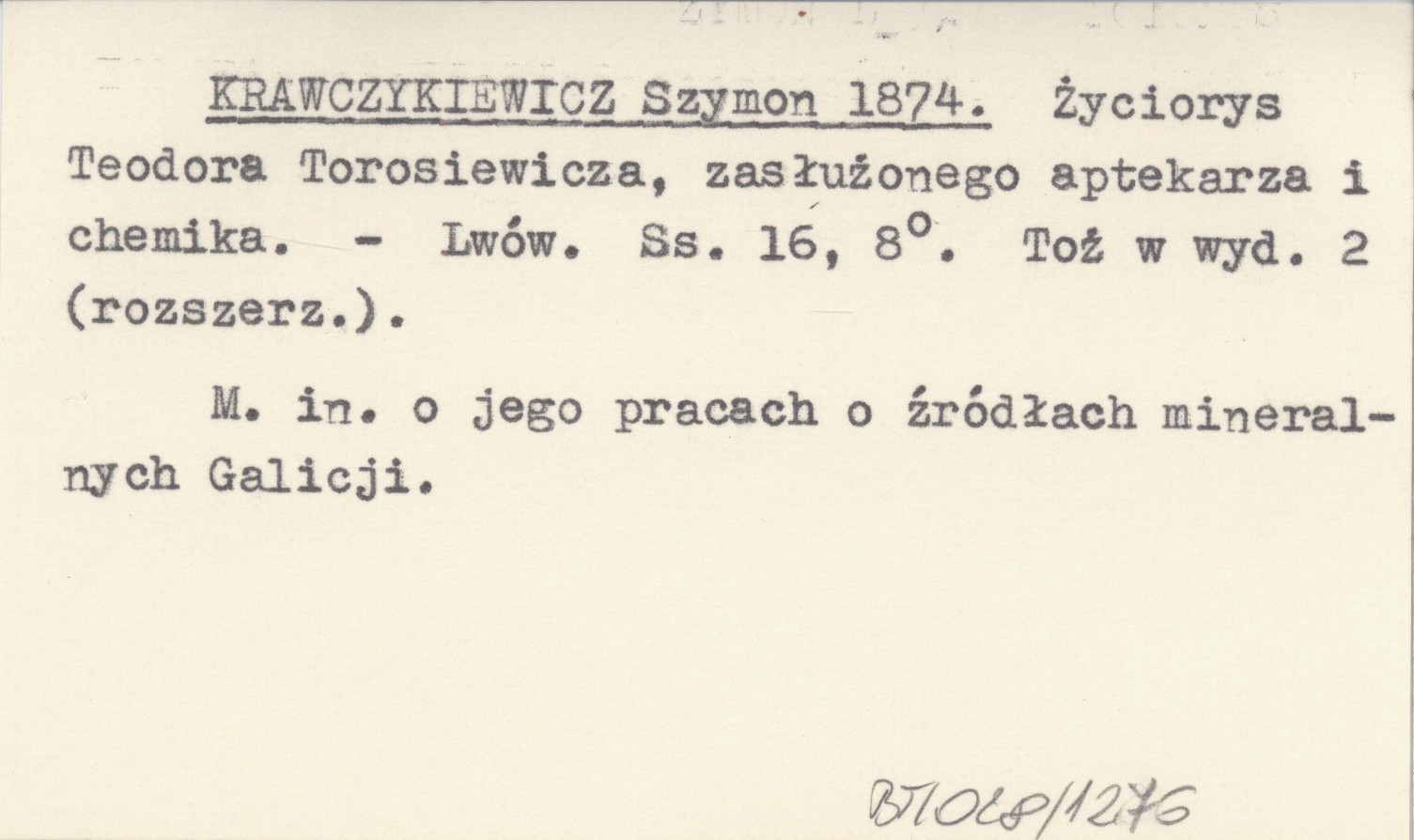 KRAWCZYKIEWICZ Szymon 1874 Życiorys Teodora Torosiewicza, zasłużonego aptekarza i chemika.