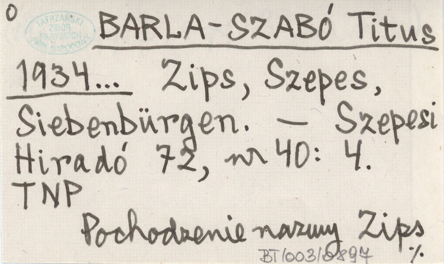 BARLA-SZABÓ Titus 1934... Zips, Szepes, Siebenbürgen.