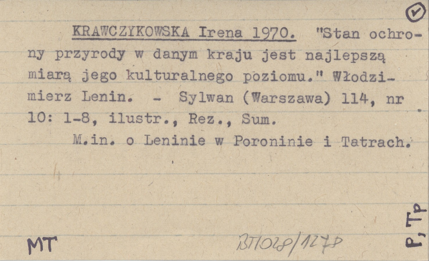 KRAWCZYKOWSKA Irena 1970 "Stan ochrony przyrody w danym kraju jest najlepszą miarą jego kulturalnego poziomu". Włodzimierz Lenin.
