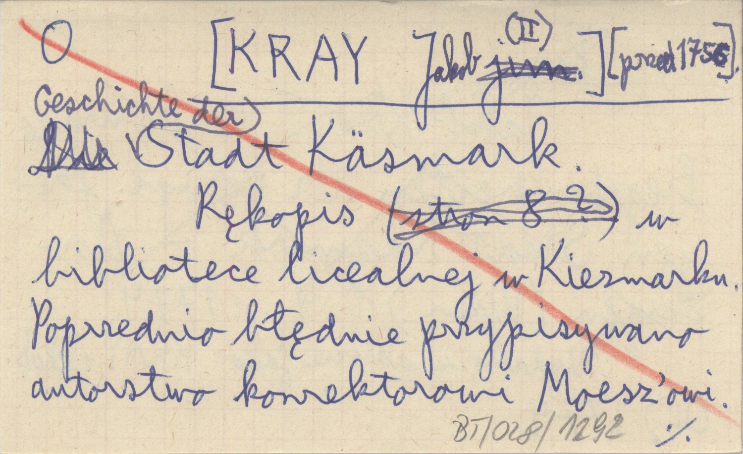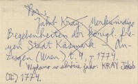 , Rękopis w bibliotece licealnej w Kiezmarku. Poprzednio błędnie przypisywano autorstwo konrektorowi Moesz'owi. Wydano w skrócie jako: KRAY Jakob (II) 1774.