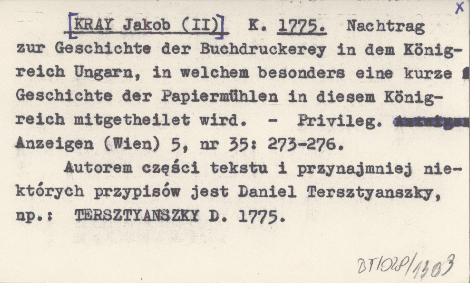 Privileg. Anzeigen (Wien) , 5, nr 35: 273-276. Autorem części tekstu i przynajmniej niektórych przypisów jest Daniel Tersztyanszky, np.: TERSZTYANSZKY D. 1775.