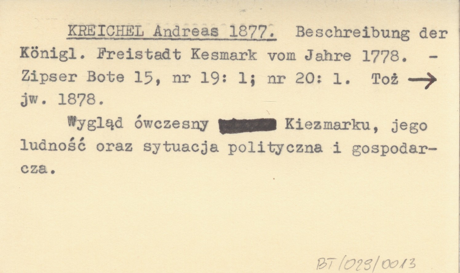 KREICHEL Andreas 1877 Beschreibung der Königl. Freistadt Kesmark vom Jahre 1778.
