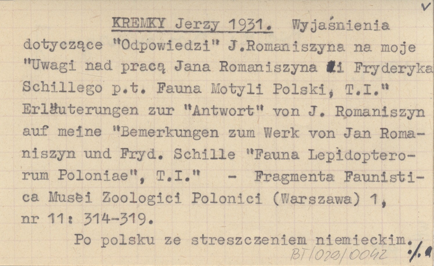 KREMKY Jerzy 1931 Wyjaśnienia dotyczące "Odpowiedzi" J. Romaniszyna na moje "Uwagi nad pracą Jana Romaniszyna i Fryderyka Schillego p.t. Fauna Motyli Polski, T. I.". Erläuterungen zur "Antwort" von J. Romaniszyn auf meine "Bemerkungen zum Werk von Jan Romaniszyn und Fryd. Schille "Fauna Lepidopterorum Poloniae", T. I."