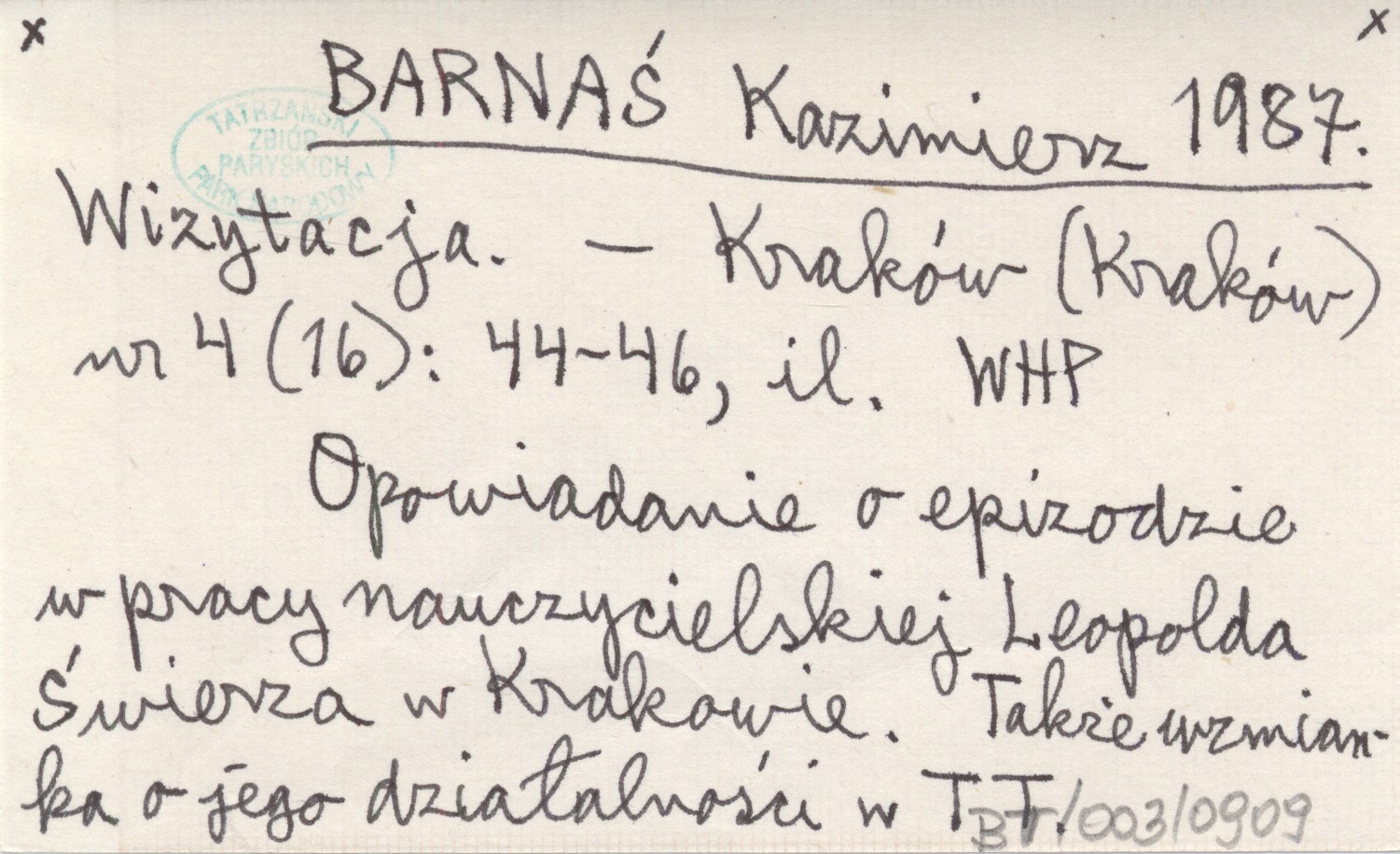 Kraków (Kraków) , Nr 4 (16): 44-46, il. Opowiadanie o epizodzie w pracy nauczycielskiej Leopolda Świerza w Krakowie. Także wzmianka o jego działalności w TT.