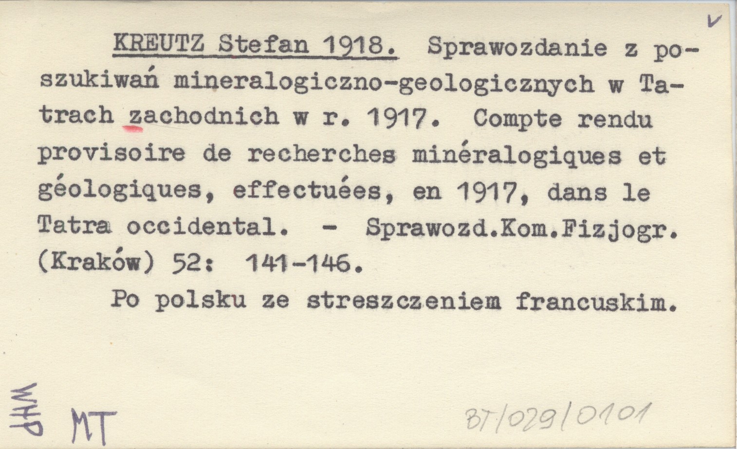 KREUTZ Stefan 1918 Sprawozdanie z poszukiwań mineralogiczno-geologicznych w Tatrach zachodnich w r. 1917. Compte rendu provisoire de recherches minéralogiques et géologiques, effectuées, en 1917, dans le Tatra occidental.