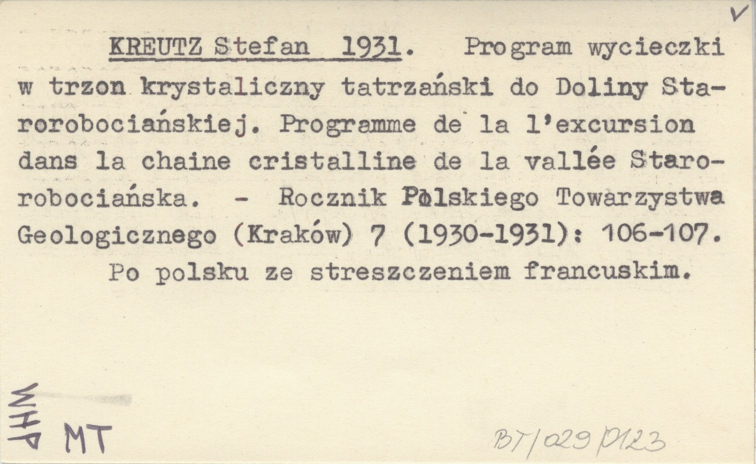 KREUTZ Stefan 1931 Program wycieczki w trzon krystaliczny tatrzański do Doliny Starorobociańskiej. Programme de la l'excursion dans la chaine cristalline de la vallée Starorobiańska.