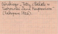 Przegląd Współczesny, R. 6, t. 22, nr 63: 137-150. S. 148: rec. o książce Konrada Górskiego "Tatry i Podhale w twórczości Jana Kasprowicza" (Zakopane 1926).